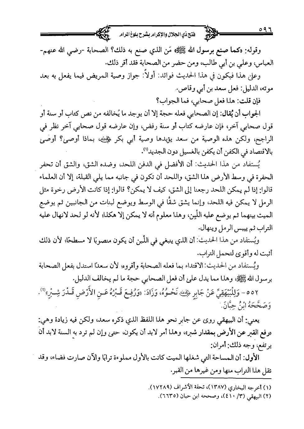 يعني: أن البيهقي روى عن جابر نحو هذا اللفظ الذي ذكره سعد، ولكن فيه زيادة وهي: "رفع القبر عن الأرض بمقدار شبر"، وهذا أمر لابد أن يكون، حتى وإن لم ترد به السنة لابد أن يرتفع، وجه ذلك: أمران:
