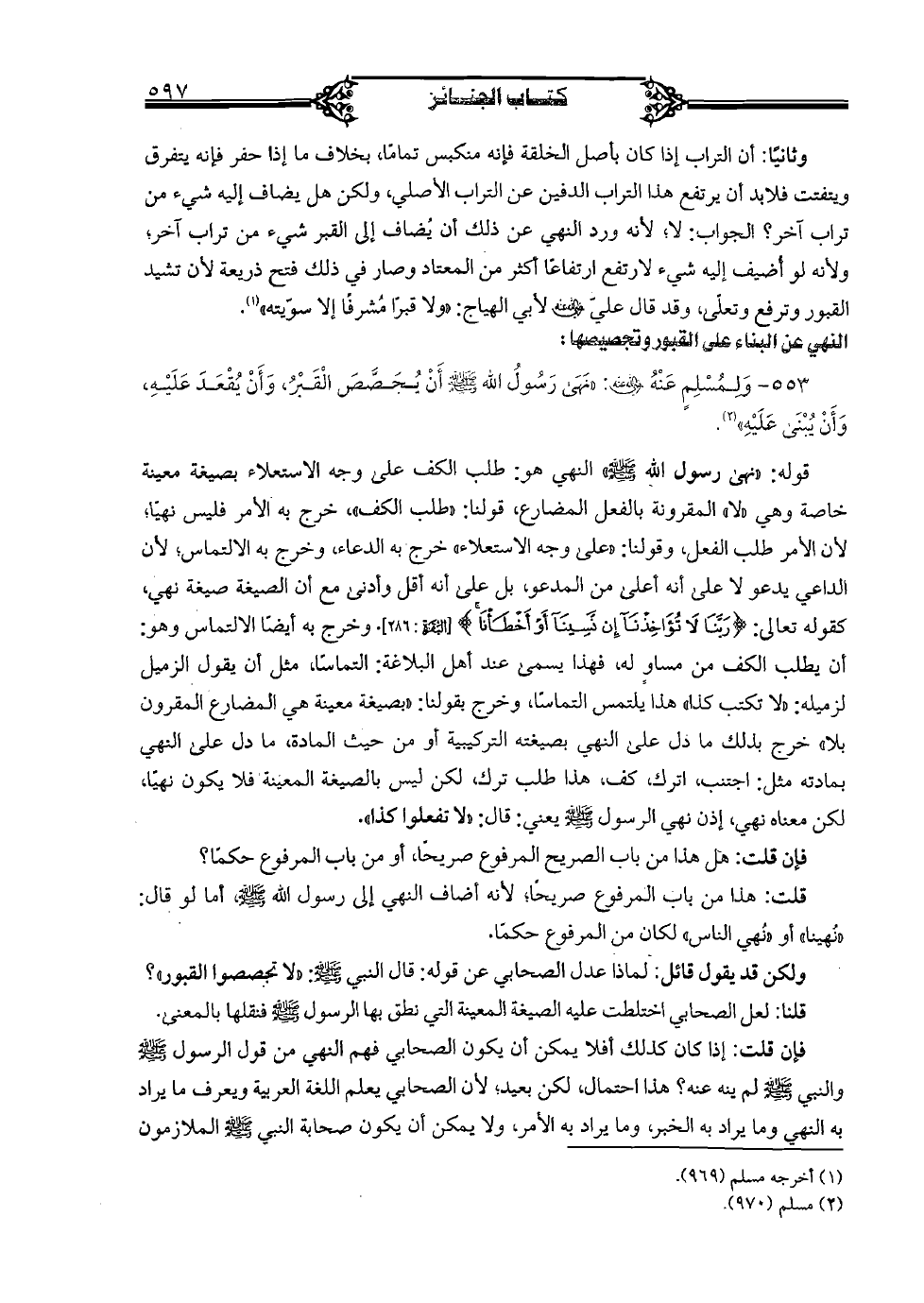 ولكن قد يقول قائل: لماذا عدل الصحابي عن قوله: قال النبي صلى الله عليه وسلم: "لا تجصصوا القبور"؟