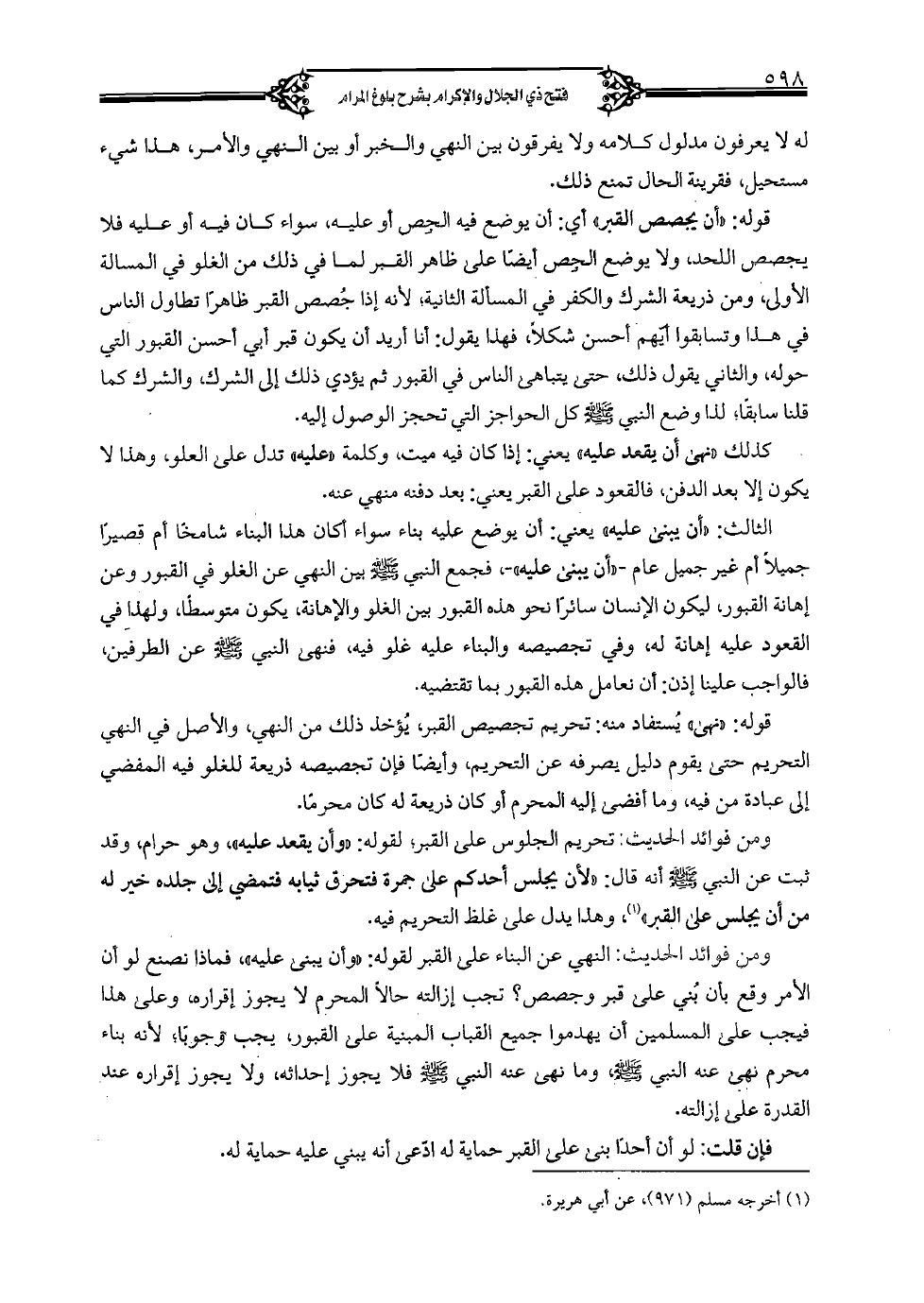 الثالث: "أن يبنى عليه" يعني: أن يوضع عليه بناء سواء أكان هذا البناء شامخًا أم قصيرًا جميلًا أم غير جميل عام- "أن يبنى عليه"-، فجمع النبي صلى الله عليه وسلم بين النهي عن الغلو في القبور وعن إهانة القبور، ليكون الإنسان سائرًا نحو هذه القبور بين الغلو والإهانة، يكون متوسطًا، ولهذا في القعود عليه إهانة له، وفي تجصيصه والبناء عليه غلو فيه، فنهى النبي صلى الله عليه وسلم عن الطرفين، فالواجب علينا إذن: أن نعامل هذه القبور بما تقتضيه.