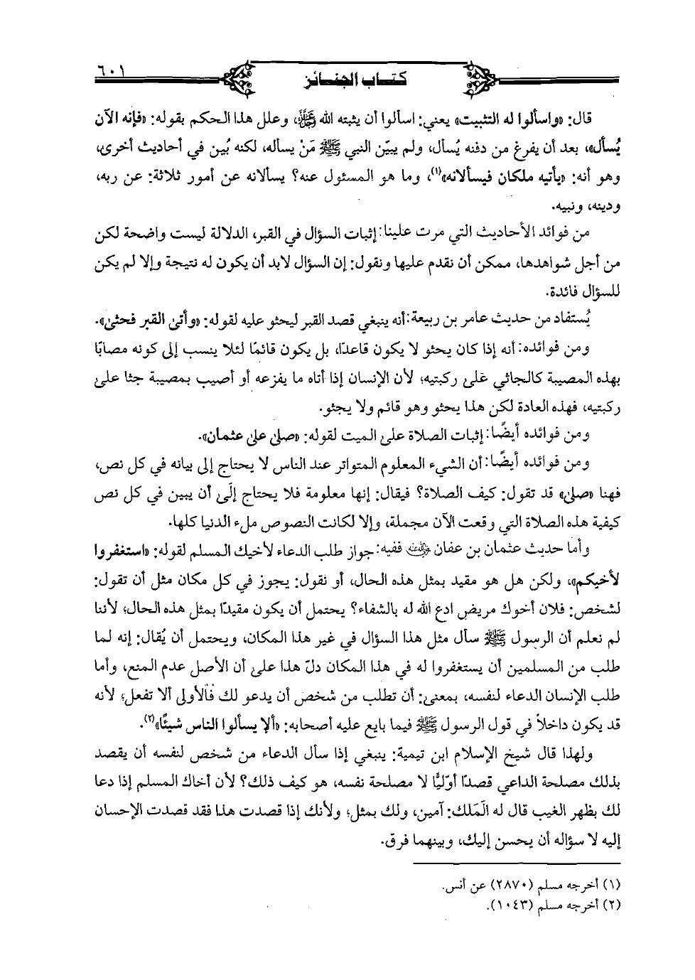 من فوائد الأحاديث التي مرت علينا: إثبات السؤال في القبر، الدلالة ليست واضحة لكن من أجل شواهدها، ممكن أن نقدم عليها ونقول: إن السؤال لابد أن يكون له نتيجة وإلا لم يكن للسؤال فائدة.