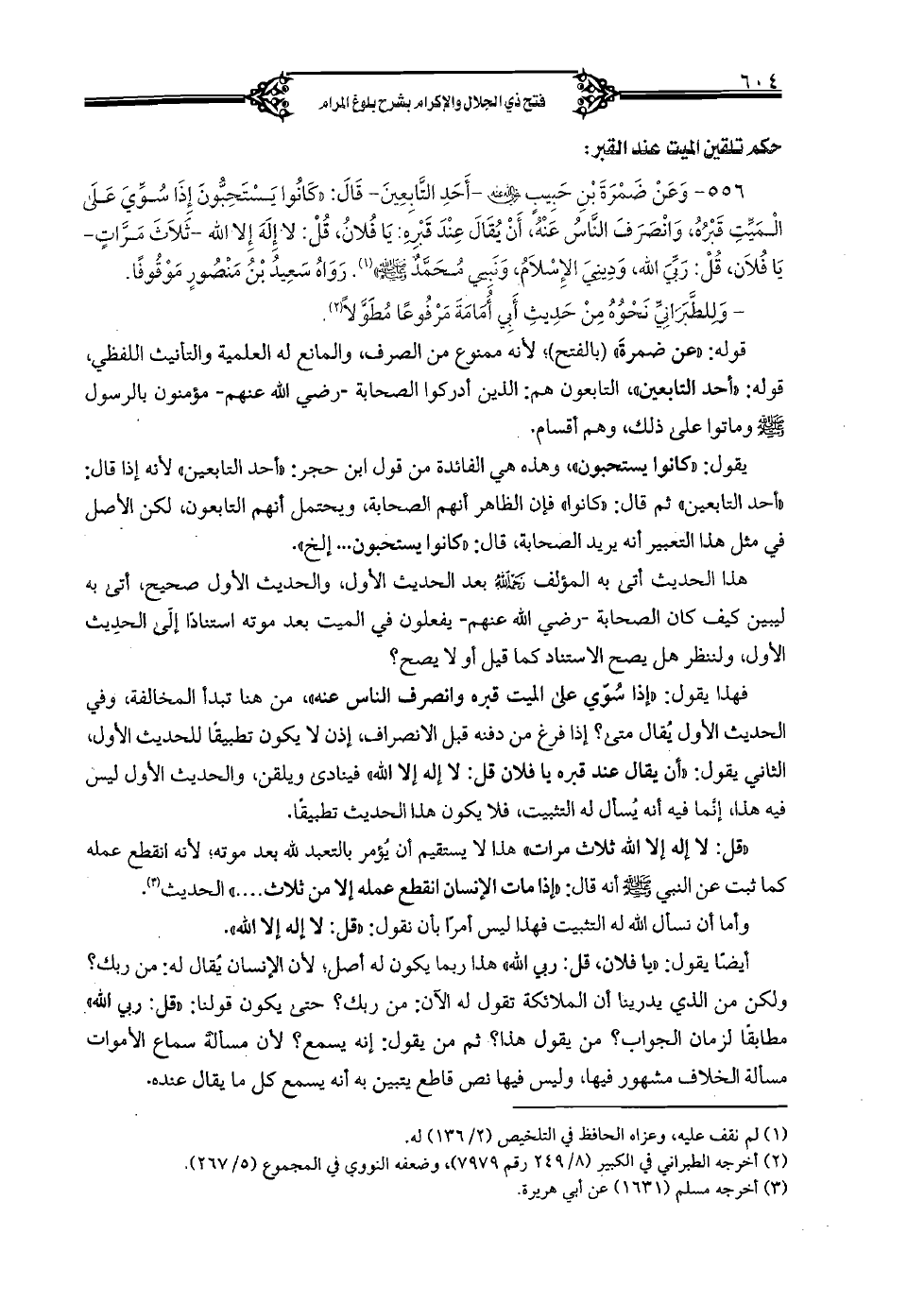 556 - وعن ضمرة بن حبيبٍ رضي الله عنه- أحد التَّابعين- قال: "كانوا يستحبُّون إذا سوِّي على الميِّت قبره، وانصرف النَّاس عنه، أن يقال عند قبره: يا فلان، قل: لا إله إلا الله- ثلاث مرَّاتٍ- يا فلان، قل: ربِّي الله، وديني الإسلام، ونبيي محمَّدٌ صلى الله عليه وسلم". رواه سعيد بن منصورٍ موقوفًا.