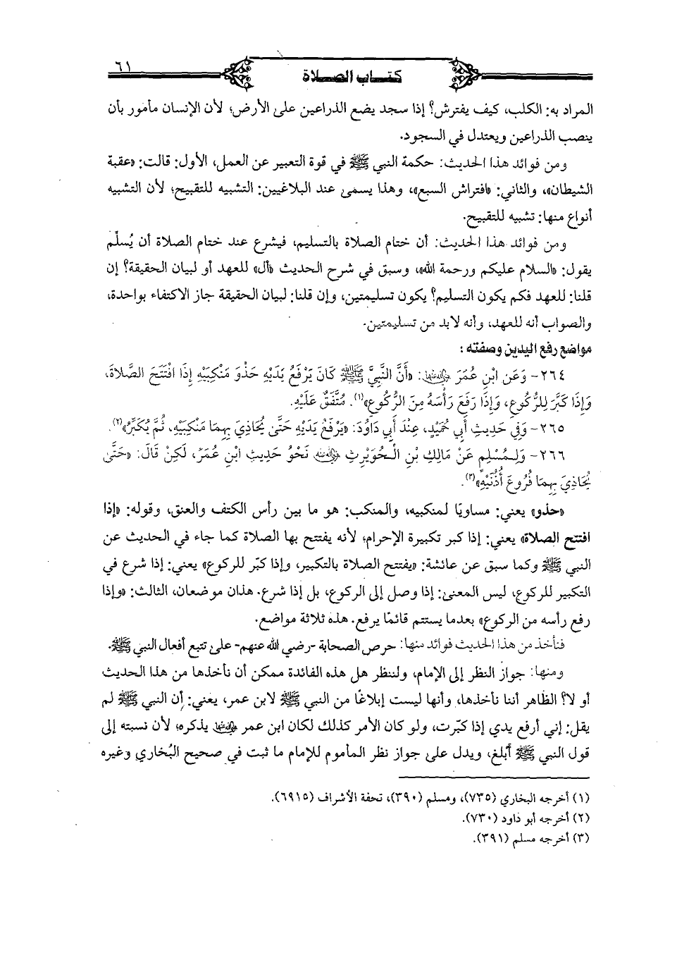 ومن فوائد هذا الحديث: حكمة النبي- صلى الله عليه وسلم- في قوة التعبير عن العمل، الأول: قالت: "عقبة الشيطان"، والثاني: "افتراش السبع"، وهذا يسمى عند البلاغيين: التشبيه للتقبيح؛ لأن التشبيه أنواع منها: تشبيه للتقبيح.