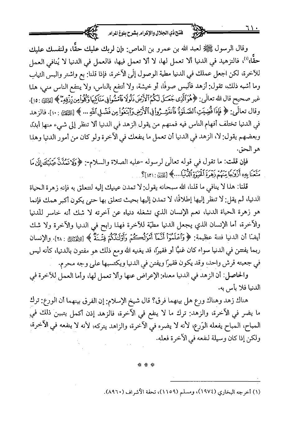 وقال الرسول صلى الله عليه وسلم لعبد الله بن عمرو بن العاص: "إن لربك عليك حقًّا، ولنفسك عليك حقًّا"، فالتزهد في الدنيا ألا تعمل لها، لا ألا تعمل فيها، فالعمل في الدنيا لا ينافي العمل للآخرة، لكن اجعل عملك في الدنيا مطية الوصول إلى الآخرة، فإذا قلنا: بع واشتر والبس الثياب وما أشبه ذلك، تقول: أزهد فألبس صوفًا، أو خيشة، ولا أنتفع بالناس، ولا ينتفع الناس مني، هذا غير صحيح قال الله تعالى: {هو الَّذي جعل لكم الأرض ذلولًا فامشوا في مناكبها وكلوا من رِّزقه} [الملك: 15]. وقال تعالى: {فإذا قضيت الصَّلاة فانتشروا في الأرض وابتغوا من فضل الله ... } [الجمعة: 10]. فالزهد في الدنيا تختلف أفهام الناس فيه فمنهم من يقول الزهد في الدنيا ألا تنظر إلى شيء منها أبدًا، وبعضهم يقول: لا، الزهد في الدنيا أن تعمل ما ينفعك في الآخرة ولو كان من أمور الدنيا وهذا هو الحق.