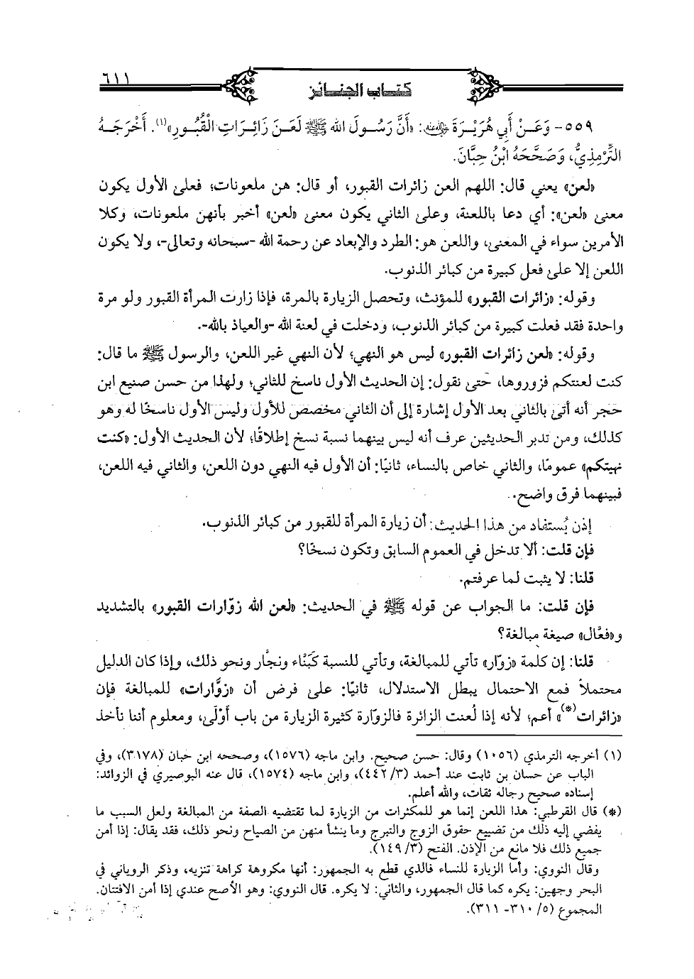 قلنا: إن كلمة "زوّار" تأتي للمبالغة، وتأتي للنسبة كبنَّاء ونجَّار ونحو ذلك، وإذا كان الدليل محتملًا فمع الاحتمال يبطل الاستدلال، ثانيًا: على فرض أن "زوَّارات" للمبالغة فإن "زائرات" أعم؛ لأنه إذا لعنت الزائرة فالزوّارة كثيرة الزيارة من باب أولى، ومعلوم أننا نأخذ