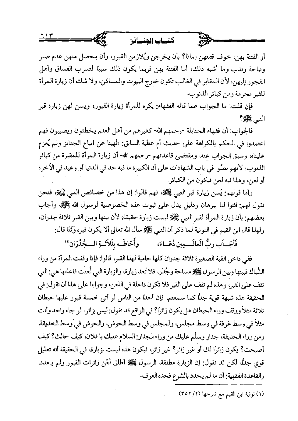 وأما قولهم: يسن زيارة قبر النبي صلى الله عليه وسلم فهم قالوا: إن هذا من خصائص النبي صلى الله عليه وسلم، فنحن نقول لهم: ائتوا لنا ببرهان ودليل يدل على ثبوت هذه الخصوصية لرسول الله صلى الله عليه وسلم، وأجاب بعضهم: بأن زيارة المرأة لقبر النبي صلى الله عليه وسلم ليست زيارة حقيقية؛ لأن بينها وبين القبر ثلاثة جدران، ولهذا قال ابن القيم في النونية لما ذكر أن النبي صلى الله عليه وسلم سأل الله تعالى ألا يكون قبره وثنًا قال: