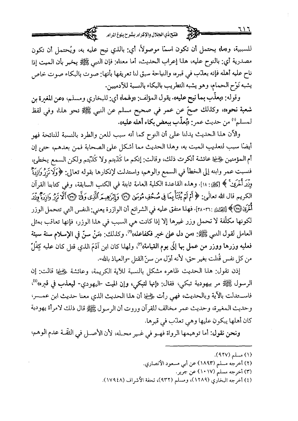 وقوله: "يعذّب بما نيح عليه". يقول المؤلف: "ولهما" أي: للبخاري ومسلم، "عن المغيرة بن شعبة نحوه"، وكذلك صحّ عن عمر في صحيح مسلم عن النبي صلى الله عليه وسلم نحو هذا، وفي لفظ لمسلم من حديث عمر: "يعذّب ببعض بكاء أهله عليه".