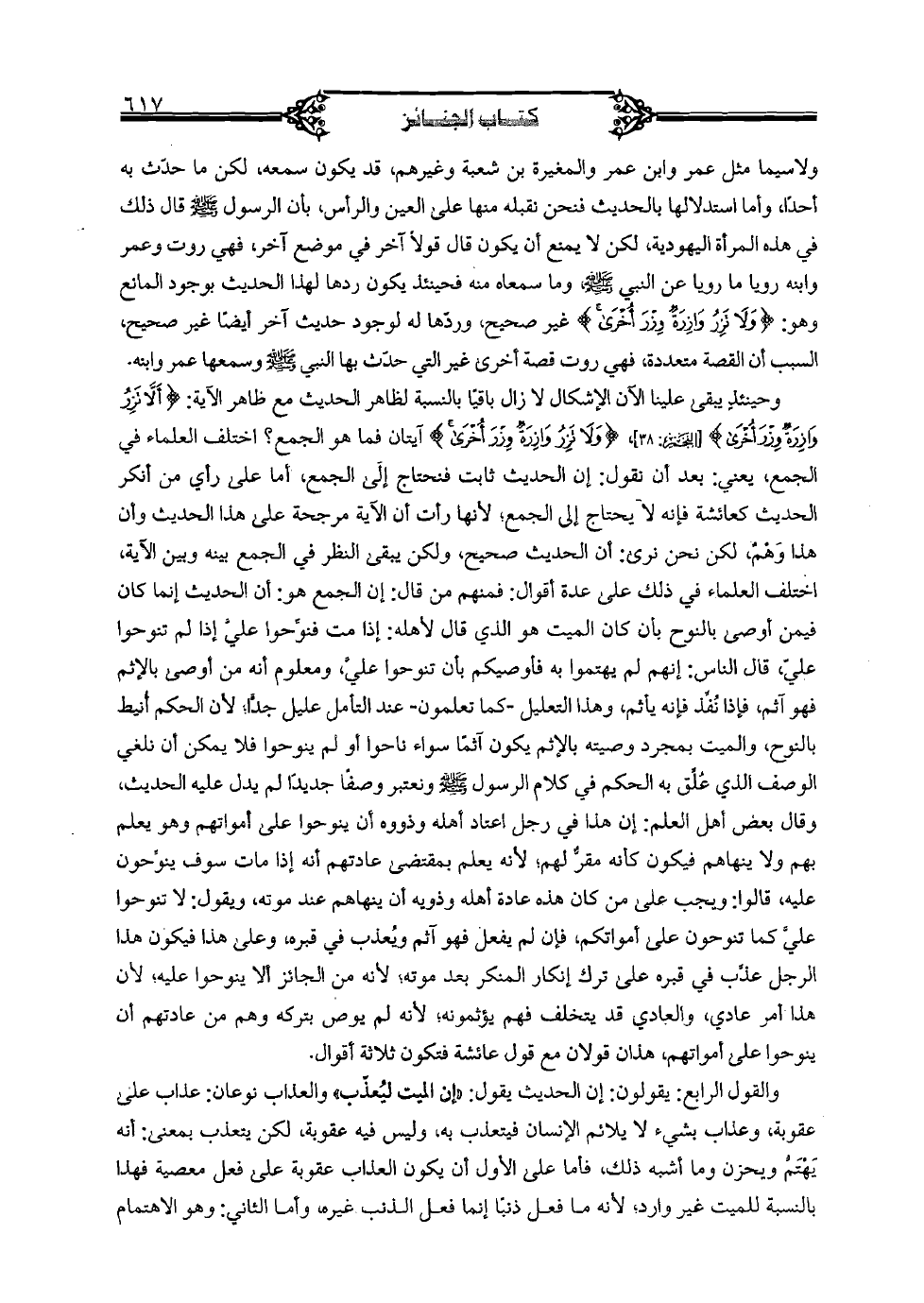 وحينئذٍ يبقى علينا الآن الإشكال لا زال باقيًا بالنسبة لظاهر الحديث مع ظاهر الآية: {ألَّا تزر وازرةً وزر أخرى} [النجم: 38]، {ولا تزر وازرةٌ وزر أخرى} آيتان فما هو الجمع؟ اختلف العلماء في الجمع، يعني: بعد أن نقول: إن الحديث ثابت فنحتاج إلى الجمع، أما على من أنكر الحديث كعائشة فإنه لا يحتاج إلى الجمع؛ لأنها رأت أن الآية مرجحة على هذا الحديث وأن هذا وهمٌ، لكن نحن نرى: أن الحديث صحيح، ولكن يبقى النظر في الجمع بينه وبين الآية، اختلف العلماء في ذلك على عدة أقوال: فمنهم من قال: إن الجمع هو: أن الحديث إنما كان فيمن أوصى بالنوح بأن كان الميت هو الذي قال لأهله: إذا مت فنوَّحوا عليَّ إذا لم تنوحوا عليّ، قال الناس: إنهم لم يهتموا به فأوصيكم بأن تنوحوا عليّ، ومعلوم أنه من أوصى بالإثم فهو آثم، فإذا نفِّذ فإنه يأثم، وهذا التعليل- كما تعلمون- عند التأمل عليل جدًّا؛ لأن الحكم أنيط بالنوح، والميت بمجرد وصيته بالإثم يكون آثمًا سواء ناحوا أو لم ينوحوا فلا يمكن أن نلغي الوصف الذي علِّق به الحكم في كلام الرسول صلى الله عليه وسلم ونعتبر وصفًا جديدًا لم يدل عليه الحديث، وقال بعض أهل العلم: إن هذا في رجا اعتاد أهله وذووه أن ينوحوا على أمواتهم وهو يعلم بهم ولا ينهاهم فيكون كأنه مقرٌّ لهم؛ لأنه يعلم بمقتضى عادتهم أنه إذا مات سوف ينوحون عليه، قالوا: ويجب على من كان هذه عادة أهله وذويه أن ينهاهم عند موته، ويقول: لا تنوحوا عليّ كما تنوحون على أمواتكم، فإن لم يفعل فهو آثم ويعذب في قبره، وعلى هذا فيكون هذا الرجل عذِّب في قبره على ترك إنكار المنكر بعد موته؛ لأنه من الجائز ألا ينوحوا عليه؛ لأن هذا أمر عادي، والعادي قد يتخلف فهم يؤثمونه؛ لأنه لم يوص بتركه وهم من عادتهم أن ينوحوا على أمواتهم، هذان قولان مع قول عائشة فتكون ثلاثة أقوال.