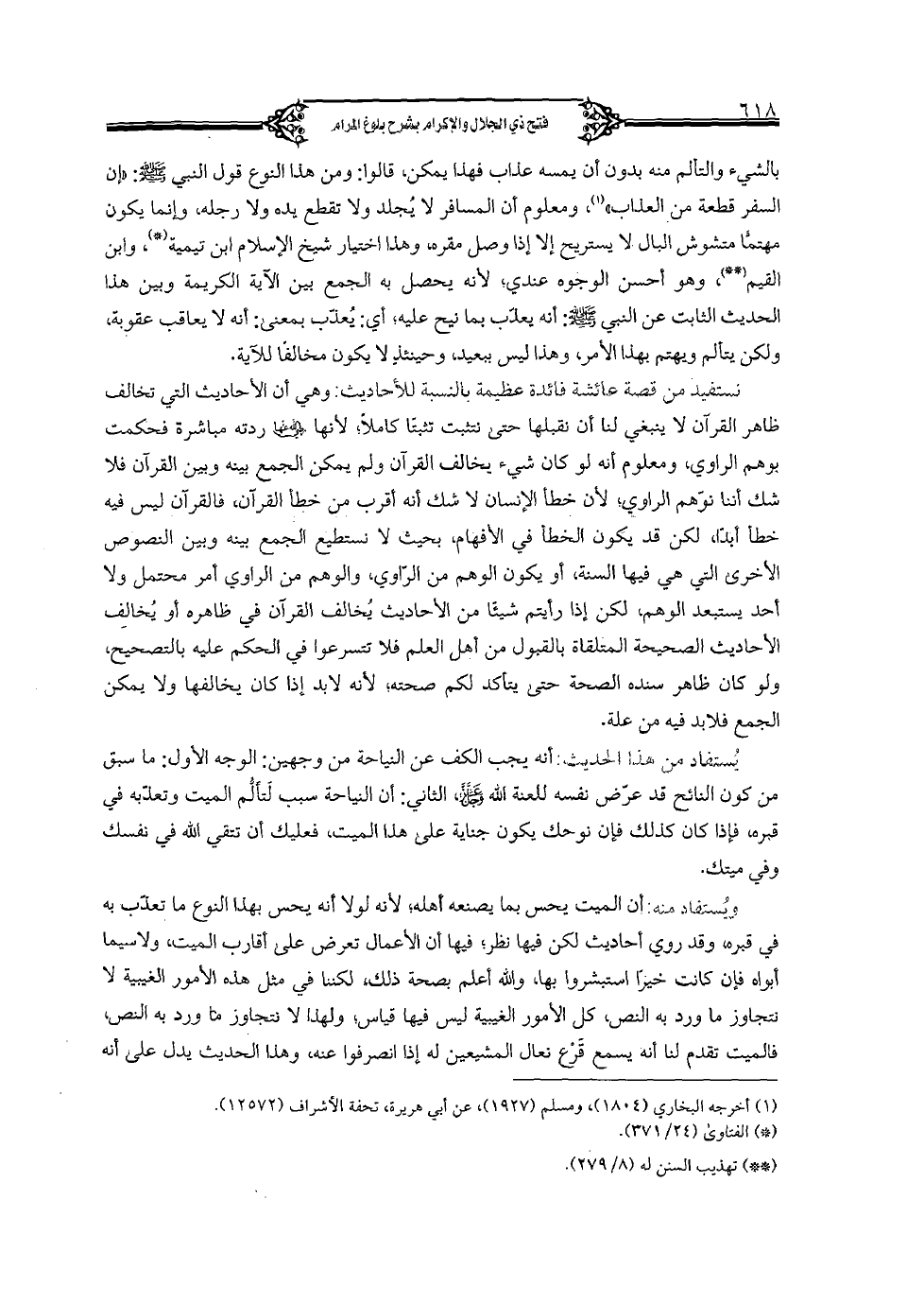 بالشيء والتألم منه بدون أن يمسه عذاب فهذا يمكن، قالوا: ومن هذا النوع قول النبي صلى الله عليه وسلم: "إن السفر قطعة من العذاب"، ومعلوم أن المسافر لا يجلد ولا تقطع يده ولا رجله، وإنما يكون مهتمًّا متشوش البال لا يستريح إلا إذا وصل مقره، وهذا اختيار شيخ الإسلام ابن تيمية، وابن القيم، وهو أحسن الوجوه عندي؛ لأنه يحصل به الجمع بين الآية الكريمة وبين هذا الحديث الثابت عن النبي صلى الله عليه وسلم: أنه يعذّب بما نيح عليه؛ أي: يعذّب بمعنى: أنه لا يعاقب عقوبة، ولكن يتألم ويهتم بهذا الأمر، وهذا ليس ببعيد، وحينئذٍ لا يكون مخالفًا للآية.