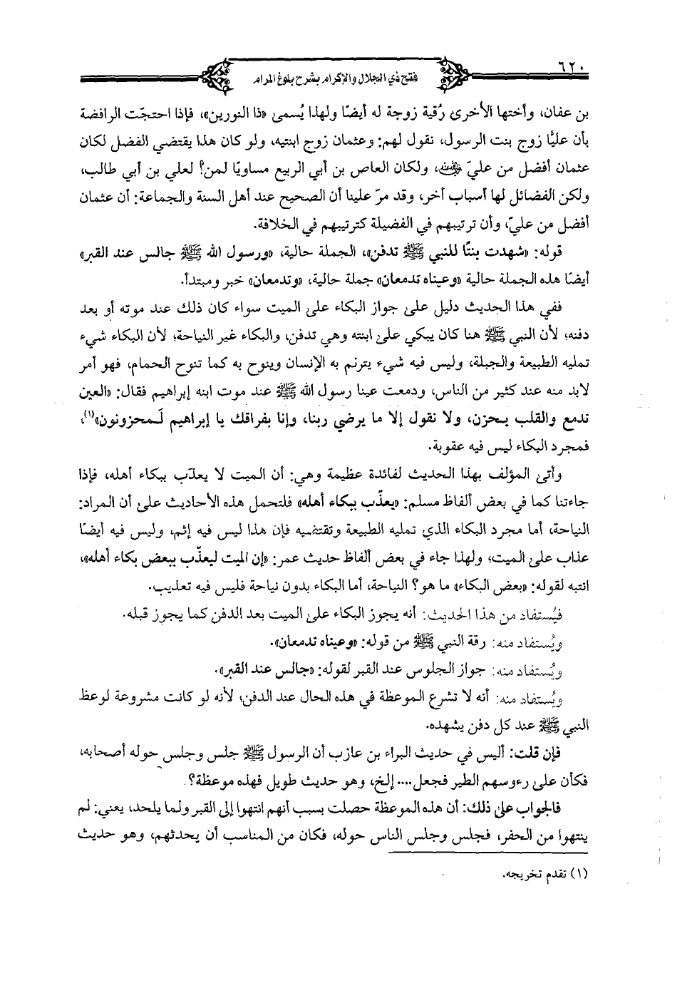 ففي هذا الحديث دليل على جواز البكاء على الميت سواء كان ذلك عند موته أو بعد دفنه؛ لأن النبي صلى الله عليه وسلم هنا كان يبكي على ابنته وهي تدفن، والبكاء غير النياحة؛ لأن البكاء شيء تمليه الطبيعة والجبلة، وليس فيه شيء يترنم به الإنسان وينوح به كما تنوح الحمام، فهو أمر لابد منه عند كثير من الناس، ودمعت عينا رسول الله صلى الله عليه وسلم عند موت ابنه إبراهيم فقال: "العين تدمع والقلب يحزن، ولا نقول إلا ما يرضي ربنا، وإنا بفراقك يا إبراهيم لمحزنون"، فمجرد البكاء ليس فيه عقوبة.