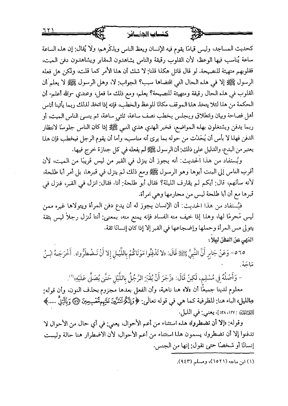 565 - وعن جابر أنَّ النَّبيَّ صلى الله عليه وسلم قال: "لا تدفنوا موتاكم باللَّيل إلا أن تضطرُّوا". أخرجه ابن ماجه.