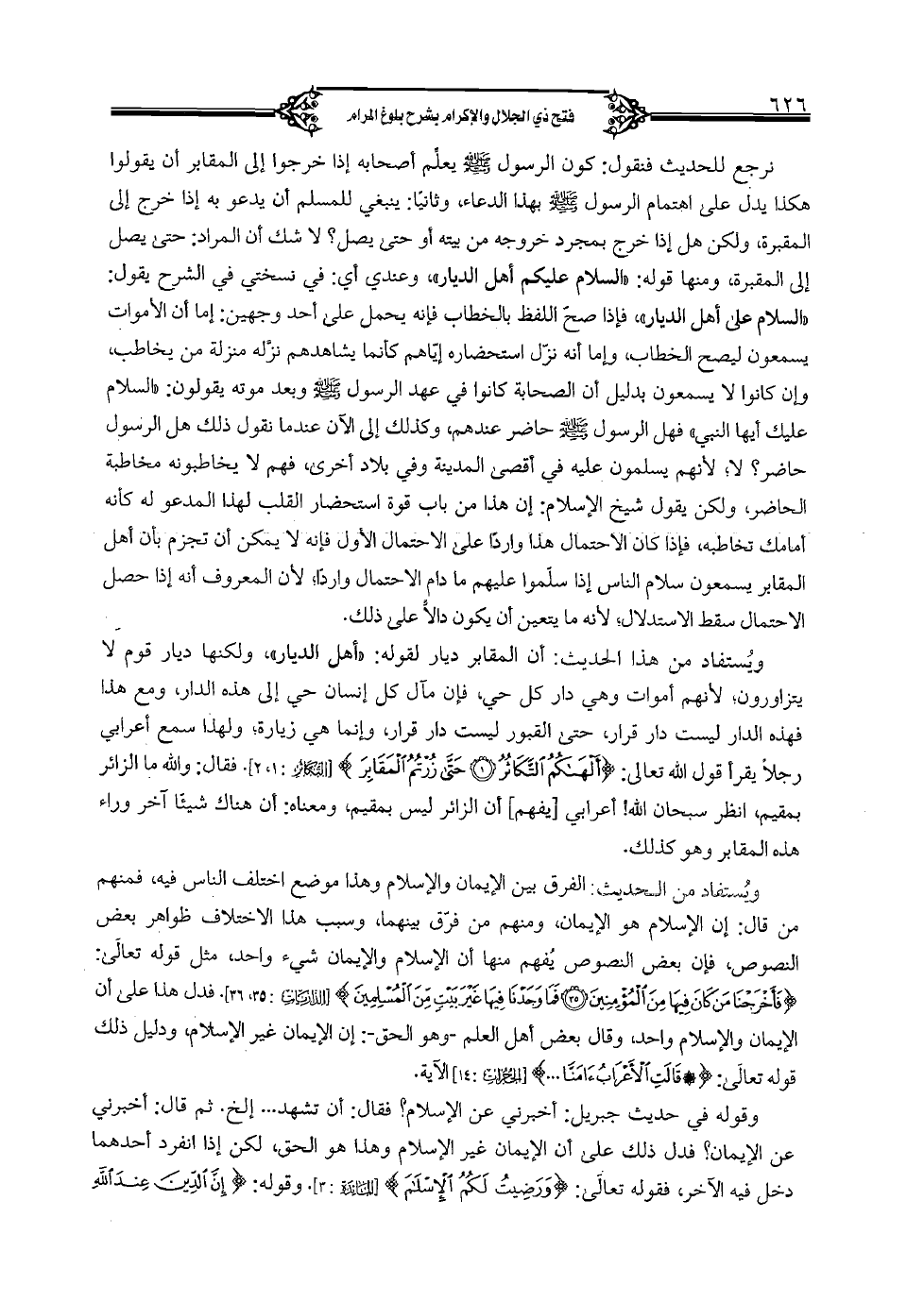 نرجع للحديث فنقول: كون الرسول صلى الله عليه وسلم يعلِّم أصحابه إذا خرجوا إلى المقابر أن يقولوا هكذا يدل على اهتمام الرسول صلى الله عليه وسلم بهذا الدعاء، وثانيًا: ينبغي للمسلم أن يدعو به إذا خرج إلى المقبرة، ولكن هل إذا خرج بمجرد خروجه من بيته أو حتى يصل؟ لا شك أن المراد: حتى يصل إلى المقبرة، ومنها قوله: "السلام عليكم أهل الديار"، وعندي أي: في نسختي في الشرح يقول: "السلام على أهل الديار"، فإذا صحّ اللفظ بالخطاب فإنه يحمل على أحد وجهين: إما أن الأموات يسمعون ليصح الخطاب، وإما أنه نزّل استحضاره إيّاهم كأنما يشاهدهم نزّله منزلة من يخاطب، وإن كانوا لا يسمعون بدليل أن الصحابة كانوا في عهد الرسول صلى الله عليه وسلم وبعد موته يقولون: "السلام عليك أيها النبي" فهل الرسول صلى الله عليه وسلم حاضر عندهم، وكذلك إلى الآن عندما نقول ذلك هل الرسول حاضر؟ لا؛ لأنهم يسلمون عليه في أقصى المدينة وفي بلاد أخرى، فهم لا يخاطبونه مخاطبة الحاضر، ولكن يقول شيخ الإسلام: إن هذا من باب قوة استحضار القلب لهذا المدعو له كأنه أمامك تخاطبه، فإذا كان الاحتمال هذا واردًا على الاحتمال الأول فإنه لا يمكن أن تجزم بأن أهل المقابر يسمعون سلام الناس إذا سلّموا عليهم ما دام الاحتمال واردًا؛ لأن المعروف أنه إذا حصل الاحتمال سقط الاستدلال؛ لأنه ما يتعين أن يكون دالًا على ذلك.