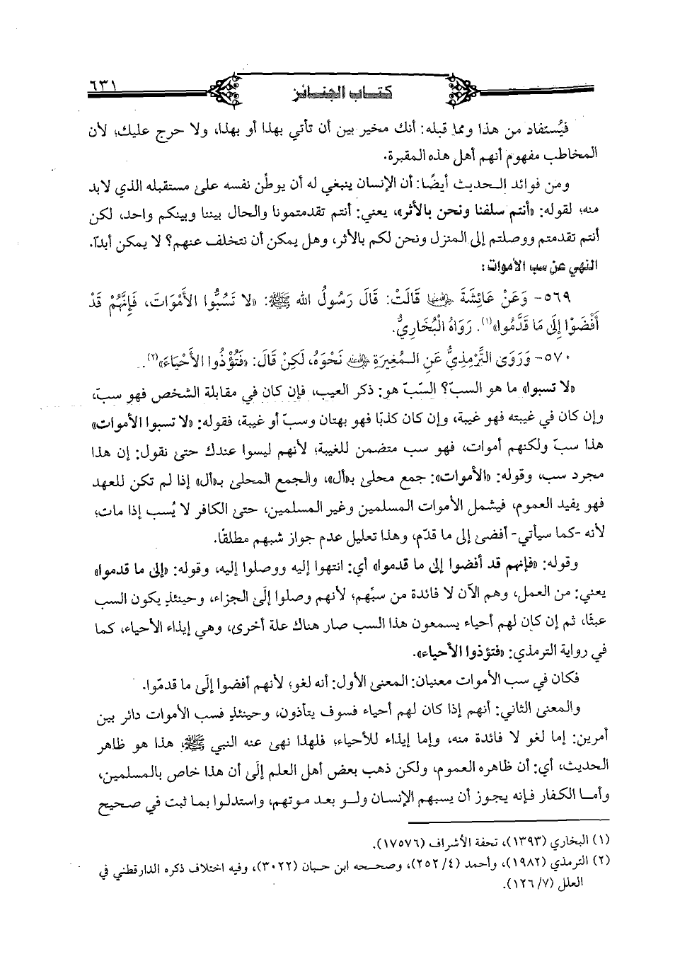 "لا تسبوا" ما هو السبّ؟ السبّ هو: ذكر العيب، فإن كان في مقابلة الشخص فهو سبّ، وإن كان في غيبته فهو غيبة، وإن كان كذبًا فهو بهتان وسبّ أو غيبة، فقوله: "لا تسبوا الأموات" هذا سبّ ولكنهم أموات، فهو سب متضمن للغيبة؛ لأنهم ليسوا عندك حتى نقول: إن هذا مجرد سب، وقوله: "الأموات": جمع محلى بـ"أل"، والجمع المحلى بـ"أل" إذا لم تكن للعهد فهو يفيد العموم، فيشمل الأموات المسلمين وغير المسلمين، حتى الكافر لا يسب إذا مات؛ لأنه- كما سيأتي- أفضى إلى ما قدّم، وهذا تعليل عدم جواز شبهم مطلقًا.