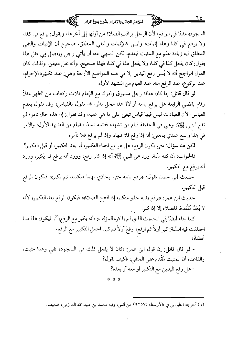 السجود" مثبتًا في الواقع؛ لأن الرجل يراقب الصلاة من أولها إلى آخرها، ويقول: يرفع في كذا، ولا يرفع في كذا وهذا إثبات، وليس كالإثبات والنفي المطلق. صحيح أن الإثبات والنفي المطلق فيه زيادة علم مع المثبت فيقدم، لكن المنهي عنه أن يأتي رجل ويفصل في مثل هذا يقول: كان يفعل كذا في كذا، ولا يفعل هذا في كذا، فهذا صحيح، وأنه نقل متيقن، ولذلك كان القول الراجح أنه لا يُسن رفع اليدين إلا في هذه المواضع الأربعة وهي: عند تكبيرة الإحرام، عند الركوع، عند الرفع منه، عند القيام من التشهد الأول.
