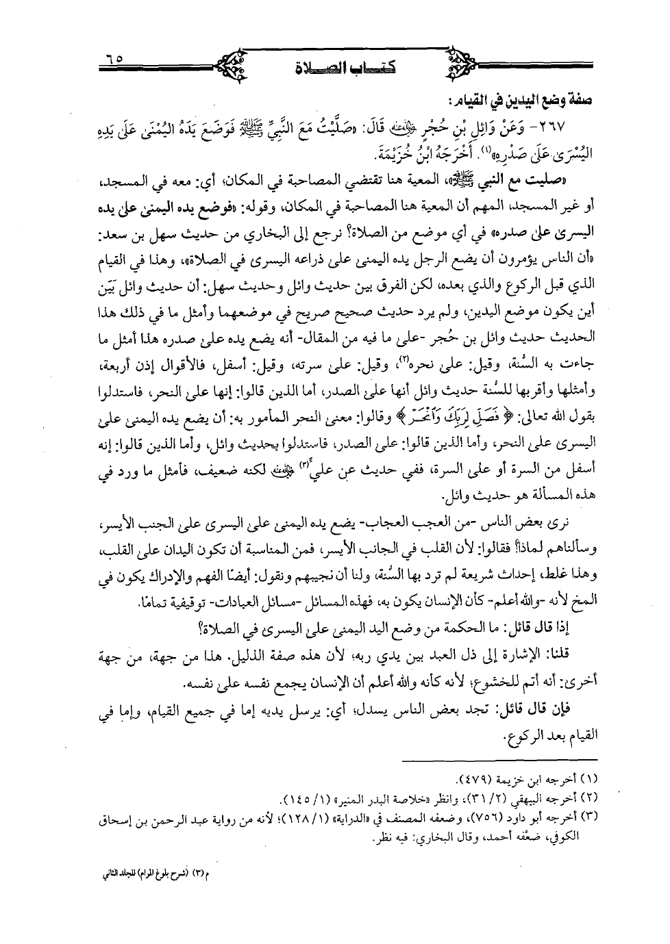 267 - وعن وائل بن حجر رضي الله عنه قال: "صليت مع النبي صلى الله عليه وسلم فوضع يده اليمنى على يده اليسرى على صدره". أخرجه ابن خزيمة.