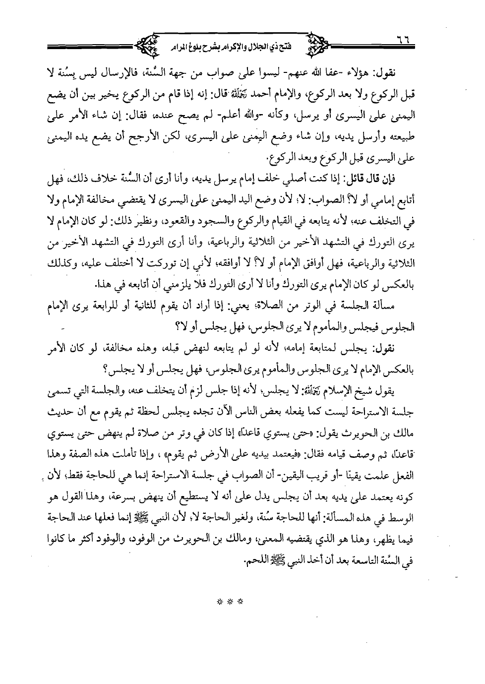 فإن قال قائل: إذا كنت أصلي خلف إمام يرسل يديه، وأنا أرى أن السنة خلاف ذلك، فهل أتابع إمامي أو لا؟ الصواب: لا، لأن وضع اليد اليمنى على اليسرى لا يقتضى مخالفة الإمام ولا في التخلف عنه؛ لأنه يتابعه في القيام والركوع والسجود والقعود، ونظير ذلك: لو كان الإمام لا يرى التورك في التشهد الأخير من الثلاثية والرباعية، وأنا أرى التورك في التشهد الأخير من الثلاثية والرباعية، فهل أوافق الإمام أو لا؟ لا أوافقه؛ لأني إن توركت لا أختلف عليه، وكذلك بالعكس لو كان الإمام يرى التورك وأنا لا أرى التورك فلا يلزمني أن أتابعه في هذا.