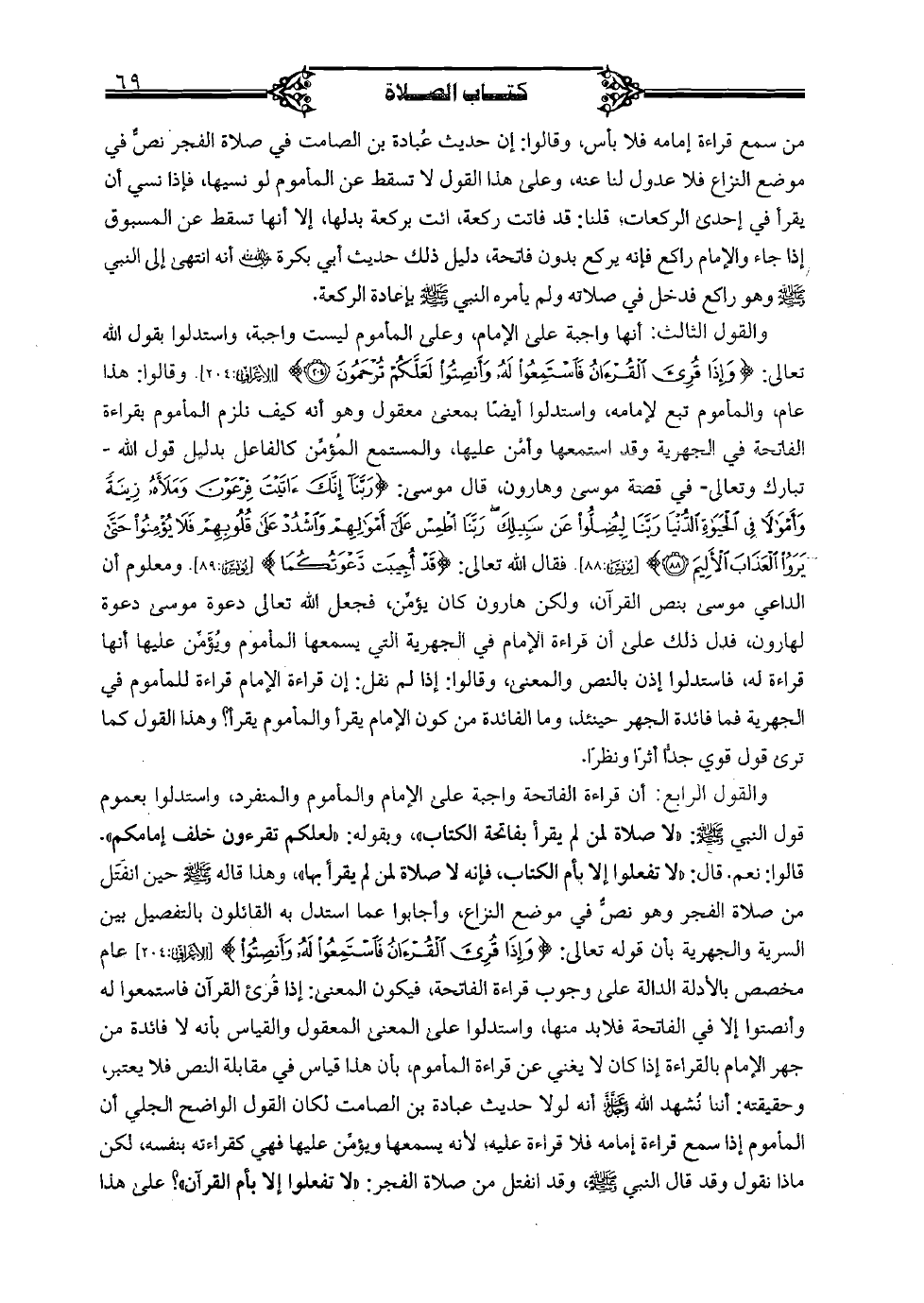 والقول الرابع: أن قراءة الفاتحة واجبة على الإمام والمأموم والمنفرد، واستدلوا بعموم قول النبي صلى الله عليه وسلم: "لا صلاة لمن لم يقرأ بفاتحة الكتاب"، وبقوله "لعلكم تقرءون خلف إمامكم". قالوا: نعم. قال: "لا تفعلوا إلا بأم الكتاب، فإنه لا صلاة لمن لم يقرأ بها"، وهذا قاله صلى الله عليه وسلم حين انفتل من صلاة الفجر وهو نصٌّ في موضع النزاع، وأجابوا عما استدل به القائلون بالتفصيل بين السرية والجهرية بأن قوله تعالى: {وإذا قرئ القرءان فاستمعوا له، وأنصتوا} [الأعراف: 204] عام مخصص بالأدلة الدالة على وجوب قراءة الفاتحة، فيكون المعنى: إذا قرئ القرآن فاستمعوا له وأنصتوا إلا في الفاتحة فلابد منها، واستدلوا على المعنى المعقول والقياس بأنه لا فائدة من جهر الإمام بالقراءة إذا كان لا يغني عن قراءة المأموم، بأن هذا قياس في مقابلة النص فلا يعتبر، وحقيقته: أننا نشهد الله عز وجل أنه لولا حديث عبادة بن الصامت لكان القول الواضح الجلي أن المأموم إذا سمع قراءة إمامه فلا قراءة عليه؛ لأنه يسمعها ويؤمن عليها فهي كقراءته بنفسه، لكن ماذا نقول وقد قال النبي صلى الله عليه وسلم، وقد انفتل من صلاة الفجر: "لا تفعلوا إلا بأم القرآن"؟ على هذا