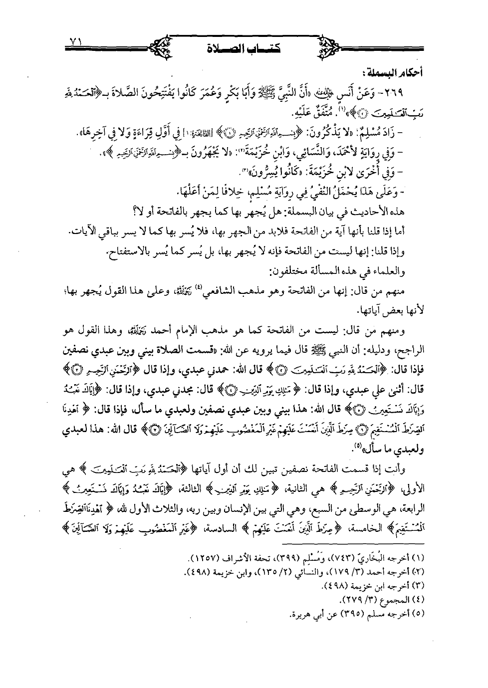 ومنهم من قال: ليست من الفاتحة كما هو مذهب الإمام أحمد رحمه الله، وهذا القول هو الراجح، ودليله: أن النبي صلى الله عليه وسلم قال فيما يرويه عن الله: "قسمت الصلاة بيني وبين عبدي نصفين فإذا قال: {الحمد لله رب العالمين (2)} قال الله: حمدني عبدي، وإذا قال {الرحمن الرحيم (2)} قال: أثنى علي عبدي، وإذا قال: {ملك يوم الدين (4)} قال: مجدني عبدي، وإذا قال: {إياك نعبد وإياك نستعين (5)} قال الله: هذا بيني وبين عبدي نصفين ولعبدي ما سأل، فإذا قال: {اهدنا الصراط المستقيم (6) صراط الذين انعمت عليهم غير المغضوب عليهم ولا الضآلين (7)} قال الله: هذا لعبدي ولعبدي ما سأل".