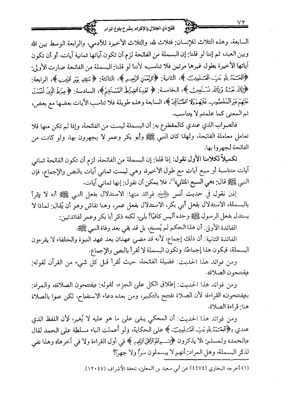 تكميلًا لكلامنا الأول نقول: إذا قلنا: إن البسملة من الفاتحة؛ لزم أن تكون الفاتحة ثماني آيات متناسبة أو سبع آيات مع طول الأخيرة، وهي ليست ثماني آيات بالنص والإجماع، فإن النبي صلى الله عليه وسلم قال: "هي السبع المثاني"، فلا يمكن أن نقول: إنها ثماني آيات.