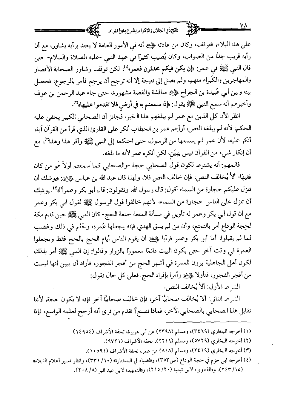فالمهم: أنه يشترط لكون قول الصحابي حجة -والصحابي كما سمعتم أولًا هو من كان فقيهًا- ألا يخالف النص، فإن خالف النص فلا، ولهذا قال عبد الله بن عباس رضي الله عنه: "يوشك أن تنزل عليكم حجارة من السماء أقول: قال رسول الله، وتقولون: قال أبو بكر وعمر؟ ! ". يوشك أن تنزل على الناس حجارة من السماء؛ لأنهم خالفوا قول الرسول صلى الله عليه وسلم لقول أبي بكر وعمر مع أن قول أبي بكر وعمر له تأويل في مسألة المتعة -متعة الحج- كان النبي صلى الله عليه وسلم حين قدم مكة لحجة الوداع أمر بالتمتع، وأن من لم يسق الهدي فإنه يجعلها عمرة، وحتم في ذلك وغضب لما لم يقبلوا، أما أبو بكر وعمر فرأيا رضي الله عنه أن يقوم الناس أيام الحج بالحج فقط ويجعلوا العمرة في وقت آخر حتى يكون البيت دائمًا معمورًا بالزوار وقالوا: إن النبي صلى الله عليه وسلم أمر بذلك لكون أهل الجاهلية يرون العمرة في أشهر الحج من أفجر الفجور، فأراد أن يبين أنها ليست من أفجر الفجور، فتأولا رضي الله عنه وأمرا بإفراد الحج. فعلى كل حال تقول: