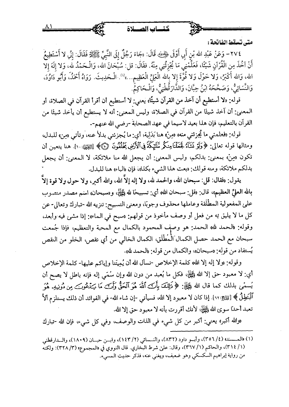 274 - وعن عبد الله بن أبى أوفى رضي الله عنه قال: "جاء رجل إلى النبي صلى الله عليه وسلم فقال: إني لا أستطيع أن آخذ من القرآن شيئًا، فعلمني ما يجزئني منه. فقال: قل: سبحان الله، والحمد لله، ولا إله إلا الله، والله أكبر، ولا حول ولا قوة إلا بالله العلي العظيم ... ". الحديث رواه أحمد، وأبو داود، والنسائي، وصححه ابن حبان، والدارقطني، والحاكم.