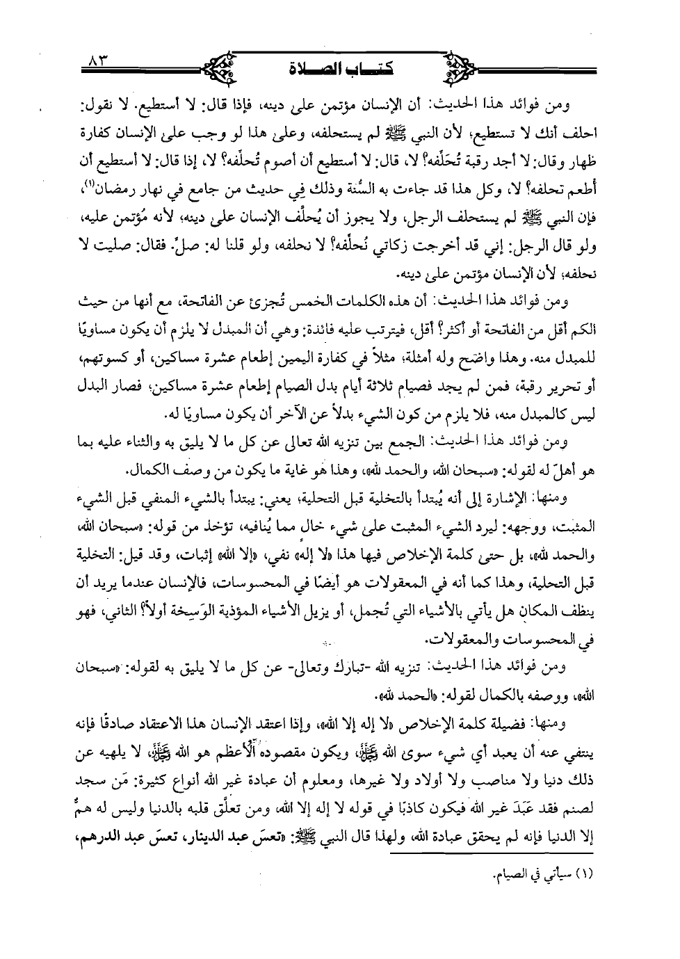 ومن فوائد هذا الحديث: أن الإنسان مؤتمن على دينه، فإذا قال: لا أستطيع. لا تقول: احلف أنك لا تستطيع؛ لأن النبي صلى الله عليه وسلم لم يستحلفه، وعلى هذا لو وجب على الإنسان كفارة ظهار وقال: لا أجد رقبة تحلفه؟ لا، قال: لا أستطيع أن أصوم تحلفه؟ لا، إذا قال: لا أستطيع أن أطعم تحلفه؟ لا، وكل هذا قد جاءت به السنة وذلك في حديث من جامع في نهار رمضان، فإن النبي صلى الله عليه وسلم لم يستحلف الرجل، ولا يجوز أن يحلف الإنسان على دينه؛ لأنه مؤتمن عليه، ولو قال الرجل: إني قد أخرجت زكاتي نحلفه؟ لا نحلفه، ولو قلنا له: صل. فقال: صليت لا نحلفه؛ لأن الإنسان مؤتمن على دينه.