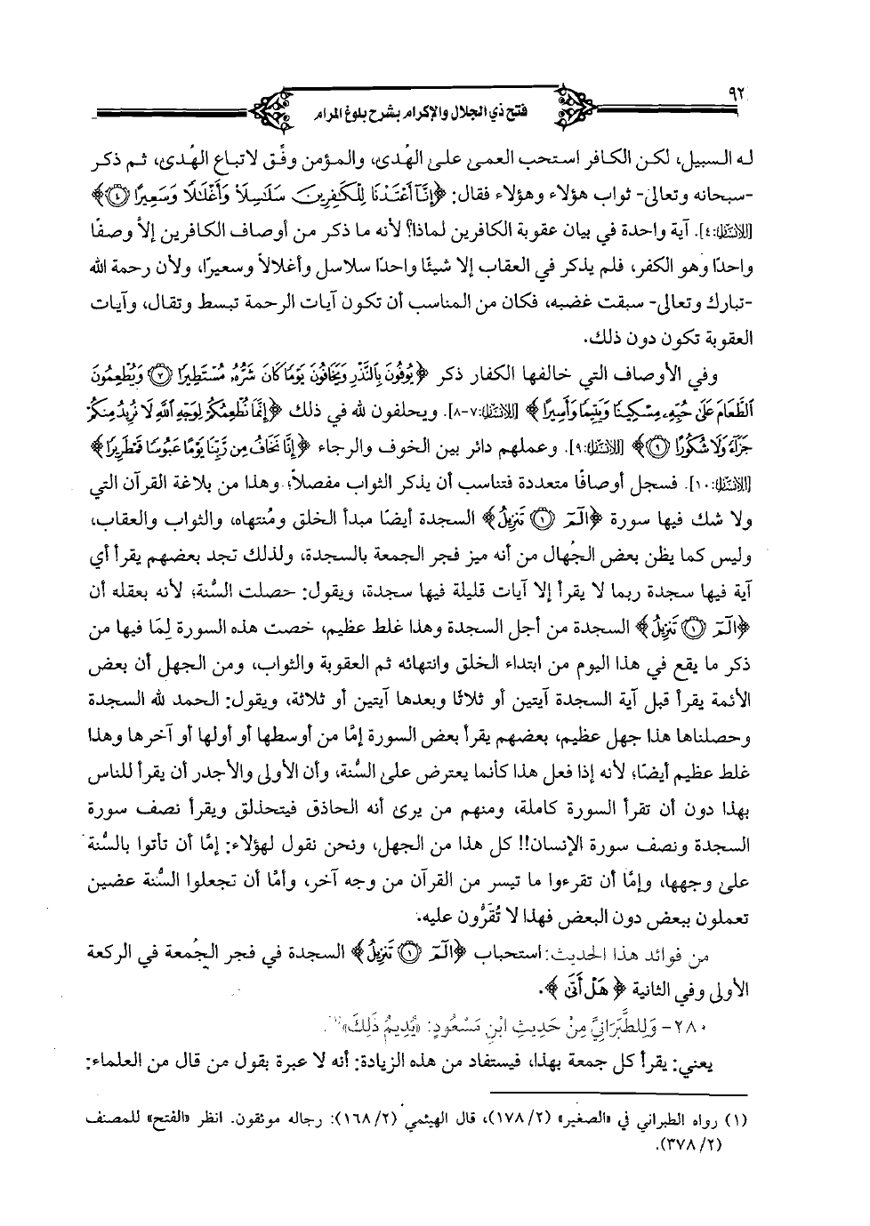 وفي الأوصاف التي خالفها الكفار ذكر {يُوفُونَ بِالنَّذْرِ ويَخَافُونَ يَوْمًا كَانَ شَرُّهُ مُسْتَطِيرًا (7) ويُطْعِمُونَ الطَّعَامَ عَلَى حُبِّهِ مِسْكِينًا ويَتِيمًا وأَسِيرًا} [الإنسان: 7 - 8]. ويحلفون لله في ذلك {إنَّمَا نُطْعِمُكُمْ لِوَجْهِ اللَّهِ لا نُرِيدُ مِنكُمْ جَزَاءً ولا شُكُورًا (9)} [الإنسان: 9].وعملهم دائر بين الخوف والرجاء {إنَّا نَخَافُ مِن رَّبِّنَا يَوْمًا عَبُوسًا قَمْطَرِيرًا} [الإنسان: 10]. فسجل أوصافًا متعددة فتناسب أن يذكر الثواب مفصلًا؛ وهذا من بلاغة القرآن التي ولا شك فيها سورة {الّم (1) تَنزِيلُ} السجدة أيضًا مبدأ الخلق ومنتهاه، والثواب والعقاب، وليس كما يظن بعض الجهال من انه ميز فجحر الجمعة بالسجدة، ولذلك تجد بعضهم يقرأ أي آية فيها سجدة ربما لا يقرأ إلا آيات قليلة فيها سجدة، ويقول: حصلت السنة؛ لأنه بعقله أن {الّم (1) تَنزِيلُ} السجدة من اجل السجدة وهذا غلط عظيم، خصت هذه السورة لما فيها من ذكر ما يقع في هذا اليوم من ابتداء الخلق وانتهائه ثم العقوبة والثواب، ومن الجهل أن بعض الأئمة يقرأ قبل آية السجدة آيتين أو ثلاثًا وبعدها آيتين أو ثلاثة، ويقول: الحمد لله السجدة وحصلناها هذا جهل عظيم، بعضهم يقرأ بعض السورة إما من أوسطها أو أولها أو آخرها وهذا غلط عظيم أيضًا؛ لأنه إذا فعل هذا كأنما يعترض على السنة، وأن الأولى والأجدر أن يقرأ للناس بهذا دون أن تقرأ السورة كاملة، ومنهم من يرى أنه الحاذق فيتحذلق ويقرأ نصف سورة السجدة ونصف سورة الإنسان! ! كل هذا من الجهل، ونحن نقول لهؤلاء: إما أن تأتوا بالسنة على وجهها، وإما أن تقرءوا ما تيسر من القرآن من وجه آخر، وأما أن تجعلوا السنة عضين تعملون ببعض دون البعض فهذا لا تقرون عليه.