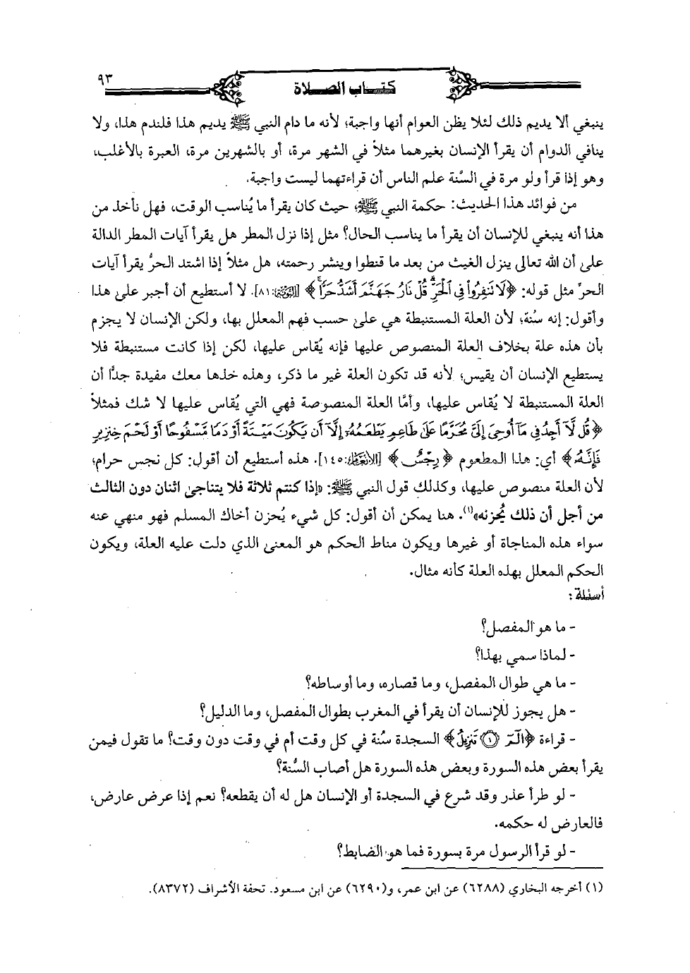 من فوائد هذا الحديث: حكمة النبي صلى الله عليه وسلم حيث كان يقرأ ما يناسب الوقت، فهل نأخذ من هذا أنه ينبغي للإنسان أن يقرأ ما يناسب الحال؟ مثل إذا نزل المطر هل يقرأ آيات المطر الدالة على أن الله تعالى ينزل الغيث من بعد ما قنطوا وينشر رحمته، هل مثلًا إذا اشتد الحر يقرأ آيات الحر مثل قوله: {لا تَنفِرُوا فِي الحَرِّ قُلْ نَارُ جَهَنَّمَ أَشَدُّ حَرًّا} [التوبة: 81]. لا أستطيع أن أجبر على هذا وأقول: إنه سنة؛ لأن العلة المستنبطة هي على حسب فعل المعلل بها، ولكن الإنسان لا يجزم بأن هذه علة بخلاف العلة المنصوص عليها فإنه يقاس عليها، لكن إذا كانت مستنبطة فلا يستطيع الإنسان أن يقيس؛ لأنه قد تكون العلة غير ما ذكر، وهذه خذها معك مفيدة جدًا أن العلة المستنبطة لا يقاس عليها، وأما العلة المنصوصة فهي التي يقاس عليها لا شك فمثلًا {قُل لاَّ أَجِدُ فِي مَا أُوحِيَ إلَيَّ مُحَرَّمًا عَلَى طَاعِمٍ يَطْعَمُهُ إلاَّ أَن يَكُونَ مَيْتَةً أَوْ دَمًا مَّسْفُوحًا أَوْ لَحْمَ خِنزِيرٍ فَإنَّهُ} أي: هذا المطعوم {رِجْسٌ} [الأنعام: 145]. هذه أستطيع أن أقول: كل نجس حرام، لأن العلة منصوص عليها، وكذلك قول النبي صلى الله عليه وسلم: "إذا كنتم ثلاثة فلا يتناجى اثنان دون الثالث من أجل أن ذلك يجزنه". هنا يمكن أن أقول: كل شيء يحزن أخاك المسلم فهو منهي عنه سواء هذه المناجاة أو غيرها ويكون مناط الحكم هو المعنى الذي دلت عليه العلة، ويكون الحكم المعلل بهذه العلة كأنه مثال. أسئلة: