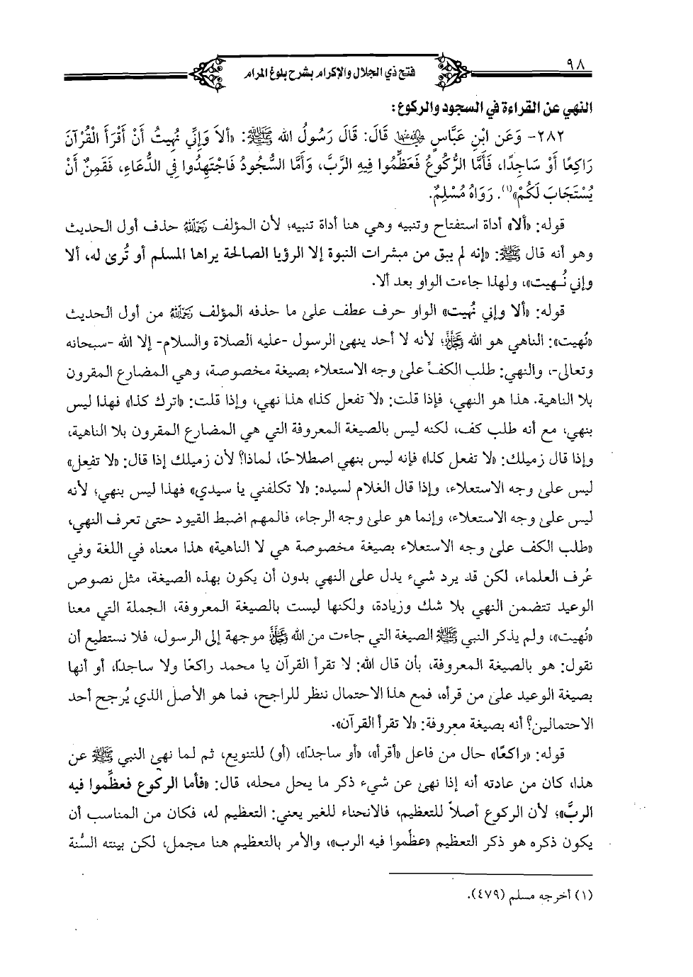قوله: "ألا وإني نهيت" الواو حرف عطف على ما حذفه المؤلف رحمه الله من أول الحديث "نهيت": الناهي هو الله عز وجل؛ لأنه لا أحد ينهى الرسول - عليه الصلاة والسلام - إلا الله - سبحانه وتعالى-، والنهي: طلب الكف على وجه الاستعلاء بصيغة مخصوصة، وهي المضارع المقرون بلا الناهية. هذا هو النهي، فإذا قلت: "لا تفعل كذا" هذا نهي، وإذا قلت: "اترك كذا" فهذا ليس بنهي، مع أنه طلب كف، لكنه ليس بالصيغة المعروفة التي هي المضارع المقرون بلا الناهية، وإذا قال زميلك: "لا تفعل كذا" فإنه ليس بنهي اصطلاحًا، لماذا؟ لأن زميلك إذا قال: "لا تفعل" ليس على وجه الاستعلاء، وإذ قال الغلام لسيده: "لا تكلفني يا سيدي" فهذا ليس بنهي؛ لأنه ليس على وجه الاستعلاء، وإنما هو على وجه الرجاء، فالمهم اضبط القيود حتى تعرف النهي، "طلب الكف على وجه الاستعلاء بصيغة مخصوصة هي لا الناهية" هذا معناه في اللغة وفي عرف العلماء، لكن قد يرد شيء يدل على النهي بدون أن يكون بهذه الصيغة، مثل نصوص الوعيد تتضمن النهي بلا شك وزيادة، ولكنها ليست بالصيغة المعروفة، الجملة التي معنا "نهيت"، ولم يذكر النبي صلى الله عليه وسلم الصيغة التي جاءت من الله عز وجل موجهة إلى الرسول، فلا نستطيع أن نقول: هو بالصيغة المعروفة، بأن قال الله: لا تقرأ القرآن يا محمد راكعًا ولا ساجدًا، أو أنها بصيغة الوعيد على من قرأه، فمع هذا الاحتمال ننظر للراجح، فما هو الأصل الذي يرجح أحد الاحتمالين؟ أنه بصيغة معروفة: "لا تقرأ القرآن".