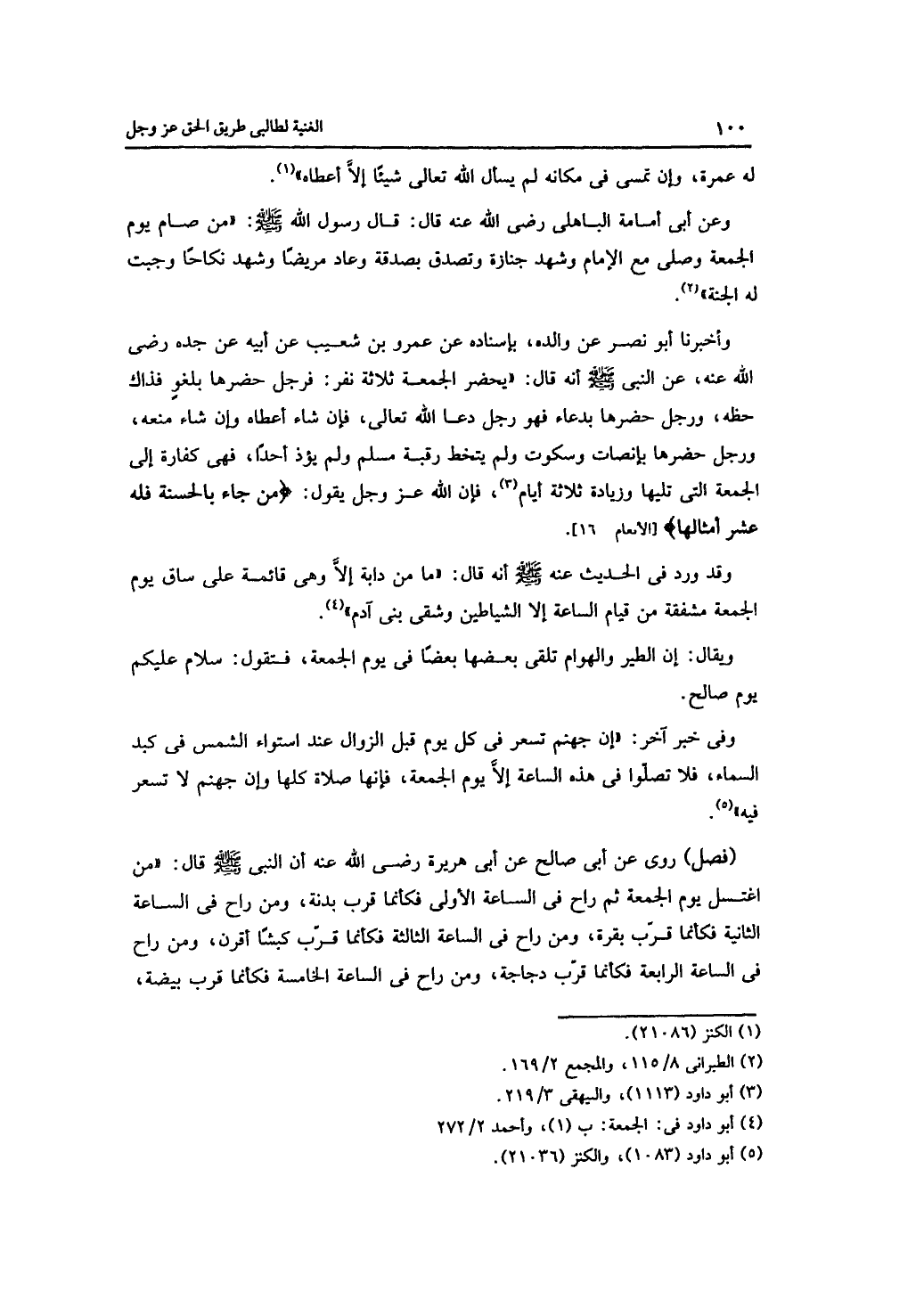 وأخبرنا أبو نصر عن والده، بإسناده عن عمرو بن شعيب عن أبيه عن جده -رضي الله عنه -، عن النبي -صلى الله عليه وسلم -أنه قال: "يحضر الجمعة ثلاثة نفر: فرجل حضرها بلغو فذاك حظه، ورجل حضرها بدعاء فهو رجل دعا الله تعالى، فإن شاء أعطاه وإن شاء منعه، ورجل حضرها بإنصات وسكوت ولم يتخط رقبة مسلم ولم يؤذ أحدًا، فهي كفارة إلى الجمعة التي تليها وزيادة ثلاثة أيام، فإن الله -عز وجل -يقول: {من جاء بالحسنة فله عشر أمثالها} [الأنعام: 16].