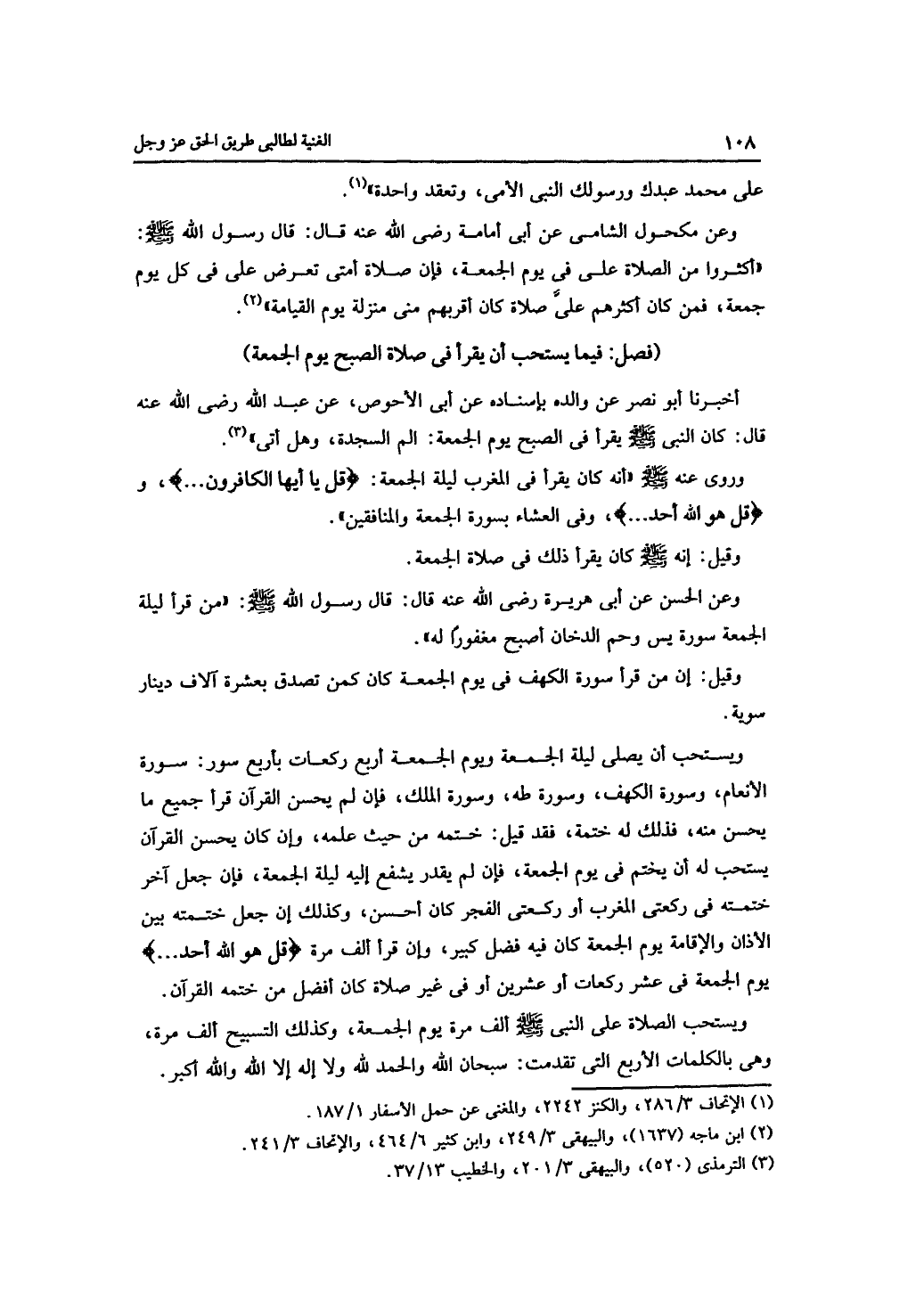أخبرنا أبو نصر عن والده بإسناده عن أبي الأحوص، عن عبد الله رضي الله عنه قال: كان النبي -صلى الله عليه وسلم- يقرأ في الصبح يوم الجمعة: الم السجدة، وهل أتى".