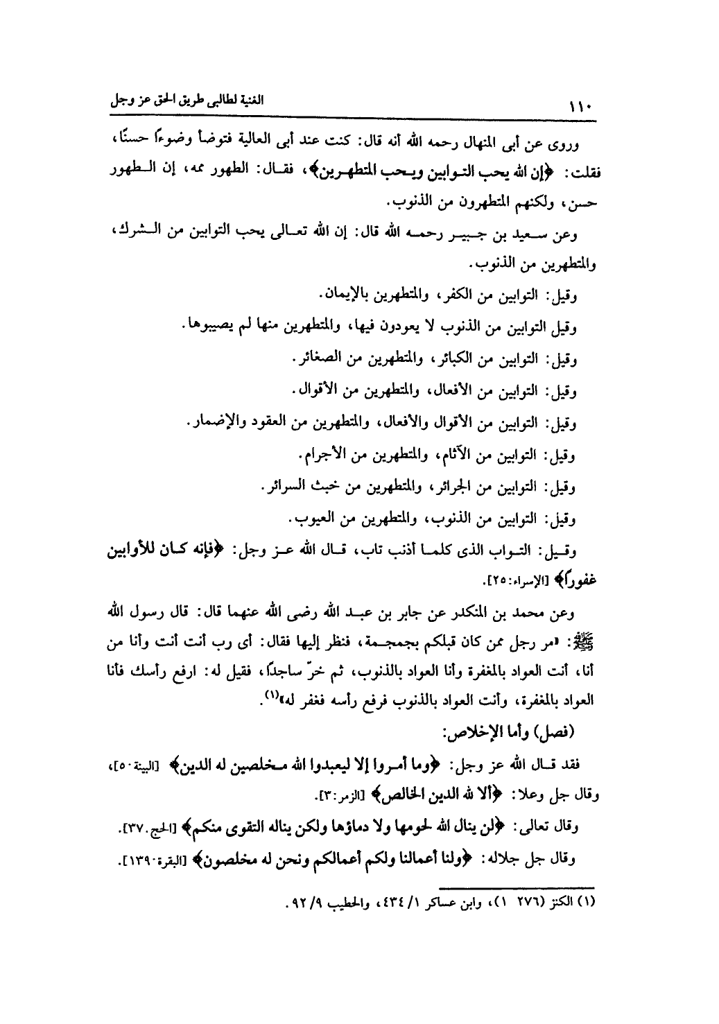 وروي عن أبي المنهال رحمه الله أنه قال: كنت عند أب العالية فتوضأ وضوءًا حسنًا، فقلت: {إن الله يحب التوابين ويحب المتطهرين}، فقل: الطهور ممه، إن الطهور حسن، ولكنهم المتطهرون من الذنوب.