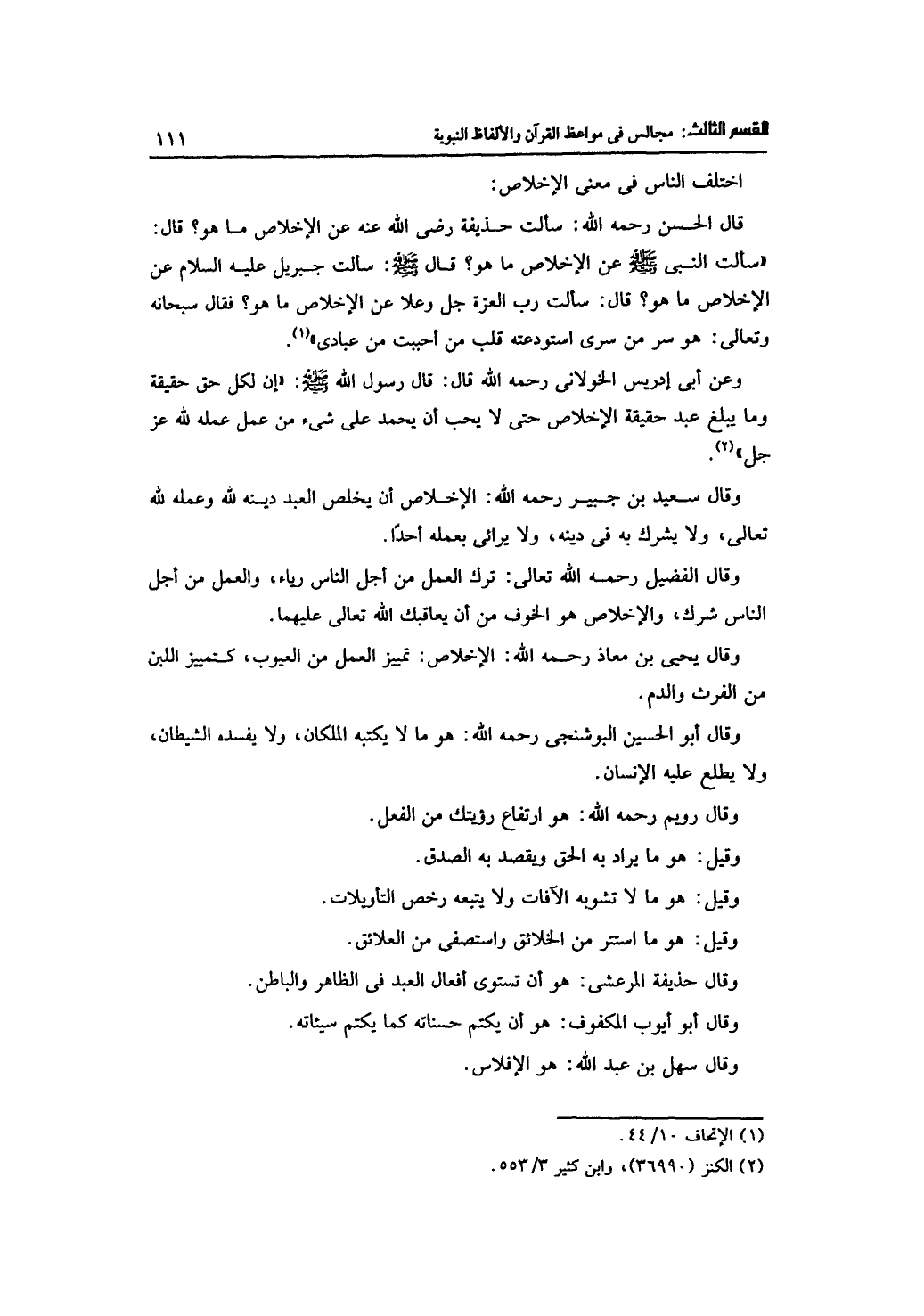 قال الحسن رحمه الله: سألت حذيفة رضي الله عنه عن الإخلاص ما هو؟ قال: "سألت النبي -صلى الله عليه وسلم- عن الإخلاص ما هو؟ قال -صلى الله عليه وسلم-: سألت جبريل عليه السلام عن الإخلاص ما هو؟ قال: سألت رب العزة جل وعلا عن الإخلاص ما هو؟ فقال سبحانه وتعالى: هو سر من سرى استودعته قلب من أحببت من عبادي".