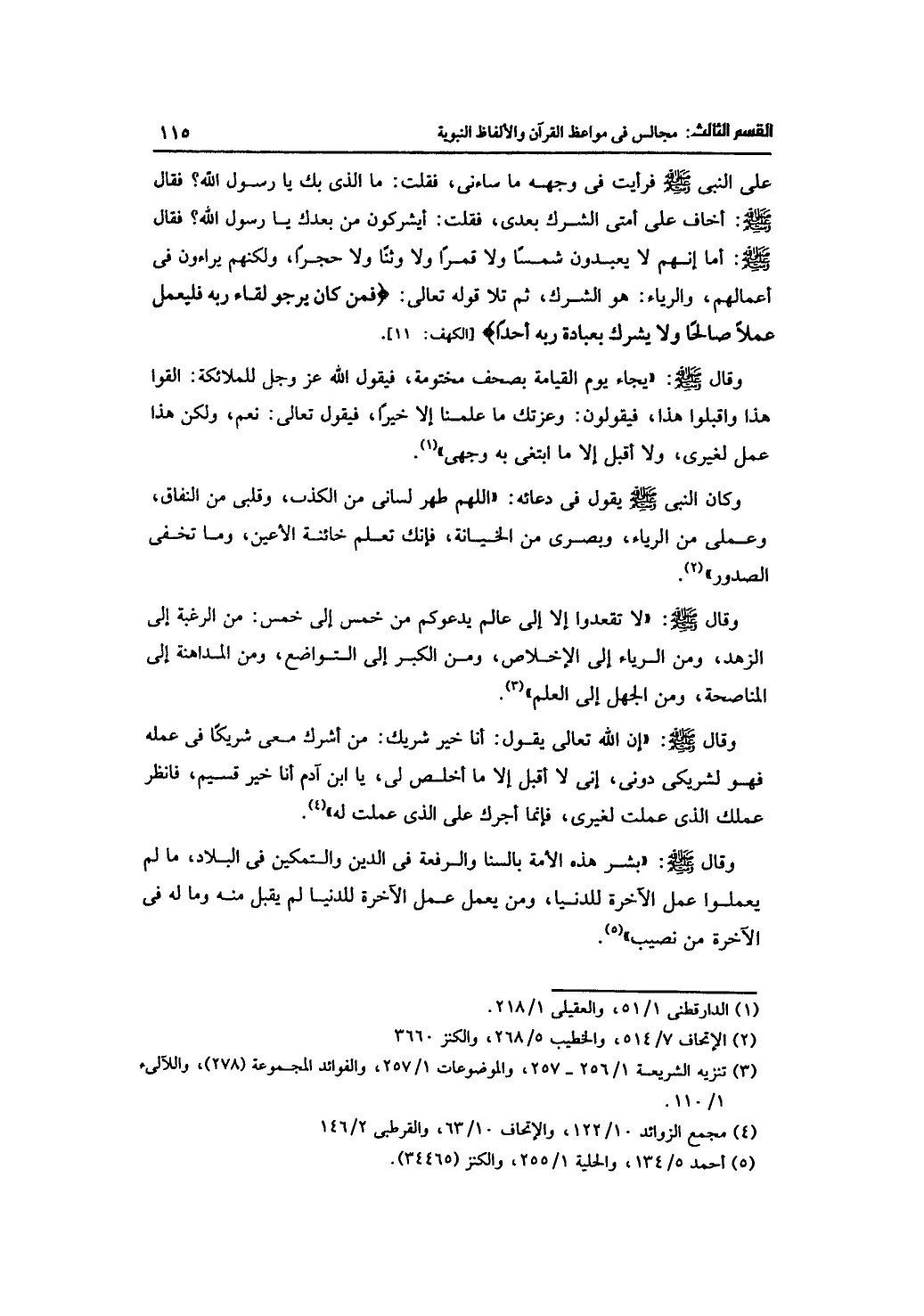 وقال -صلى الله عليه وسلم-: "إن الله تعالى يقول: أنا خير شريك: من أشرك معي شريكاً في عمله فهو لشريكي دوني، إني لا أقبل إلا ما أخلص لي، يا ابن آدم أنا خير قسيم، فانظر عملك الذي عملت لغيري، فإنما أجرك على الذي عملت له".