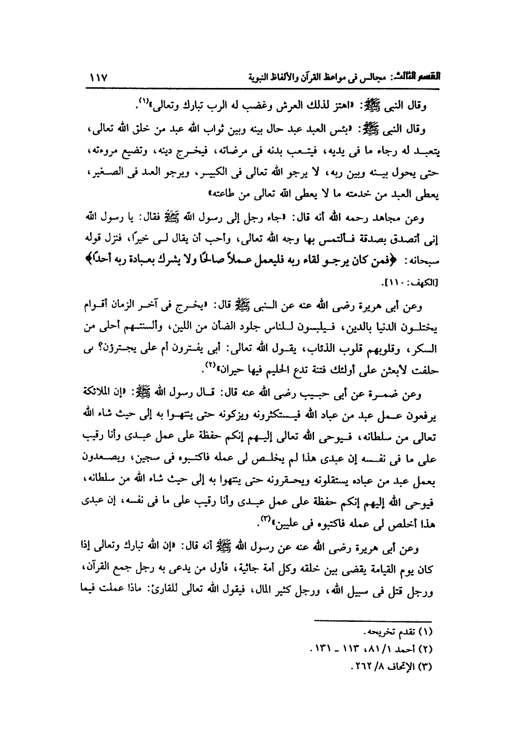 وعن أبي هريرة رضي الله عنه عن رسول الله -صلى الله عليه وسلم- أنه قال: "إن الله تبارك وتعالى إذا كان يوم القيامة يقضي بين خلقه وكل أمة جائية، فأول من يدعى به رجل جمع القرآن، ورجل قتل في سبيل الله، ورجل كثير المال، فيقول الله تعالى للقارئ: ماذا عملت فيما