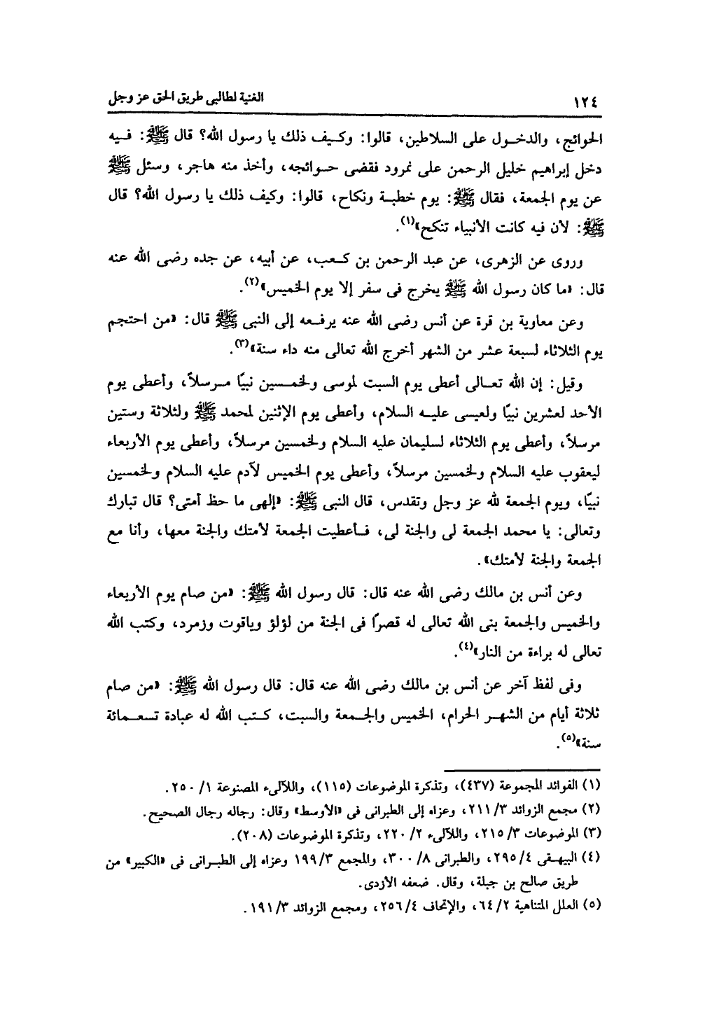 الحوائج، والدخول على السلاطين، قالوا: وكيف ذلك يا رسول الله؟ قال -صلى الله عليه وسلم-: فيه دخل إبراهيم خليل الرحمن على نمرود فقضى حوائجه، وأخذ منه هاجر، وسئل -صلى الله عليه وسلم- عن يوم الجمعة، فقال -صلى الله عليه وسلم-: يوم خطبة ونكاح، قالوا: وكيف ذلك يا رسول الله؟ قال -صلى الله عليه وسلم-: لأن فيه كانت الأنبياء تنكح".