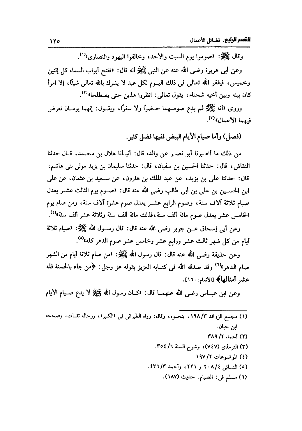 من ذلك ما أخبرنا أبو نصر عن والده قال: أنبأنا هلال بن محمد، قال حدثنا النقاش، قال: حدثنا الحسين بن سفيان، قال: حدثنا سليمان بن يزيد مولى بن هاشم، قال: حدثنا على بن يزيد، عن عبد الملك بن هارون، عن سعيد بن عثمان، عن علي ابن الحسين بن علي بن أبي طالب رضي الله عنه قال: "صوم يوم الثالث عشر يعدل صيام ثلاثة آلاف سنة، وصوم الرابع عشر يعدل صوم عشرة آلاف سنة، ومن صام يوم الخامس عشر يعدل صوم مائة ألف سنة، فذلك مائة ألف سنة وثلاثة عشر ألف سنة".
