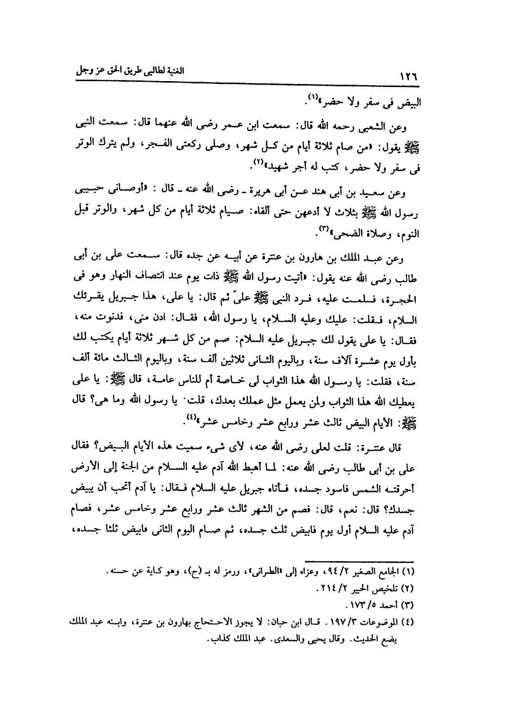 وعن عبد الملك بن هارون بن عنترة عن أبيه عن جده قال: سمعت على بن أبي طالب رضي الله عنه يقول: "أتيت رسول الله -صلى الله عليه وسلم- ذات يوم عند انتصاف النهار وهو في الحجرة، فسلمت عليه، فرد النبي -صلى الله عليه وسلم- علىّ ثم قال: يا علي، هذا جبريل يقرئك السلام، فقلت: عليك وعليه السلام، يا رسول الله، فقال: ادن مني، فدنوت منه، فقال: يا على يقول لك جبريل عليه السلام: صم من كل شهر ثلاثة أيام يكتب لك بأول عشرة آلاف سنة، وباليوم الثاني ثلاثين ألف سنة، وباليوم الثالث مائة ألف سنة، فقلت: يا رسول الله هذا الثواب لي خاصة أم للناس عامة، قال -صلى الله عليه وسلم: يا على يعطيك الله هذا الثواب ولمن يعمل مثل عملك بعدك، قلت: يا رسول الله وما هي؟ قال -صلى الله عليه وسلم: الأيام البيض ثالث عشر ورابع عشر وخامس عشر".