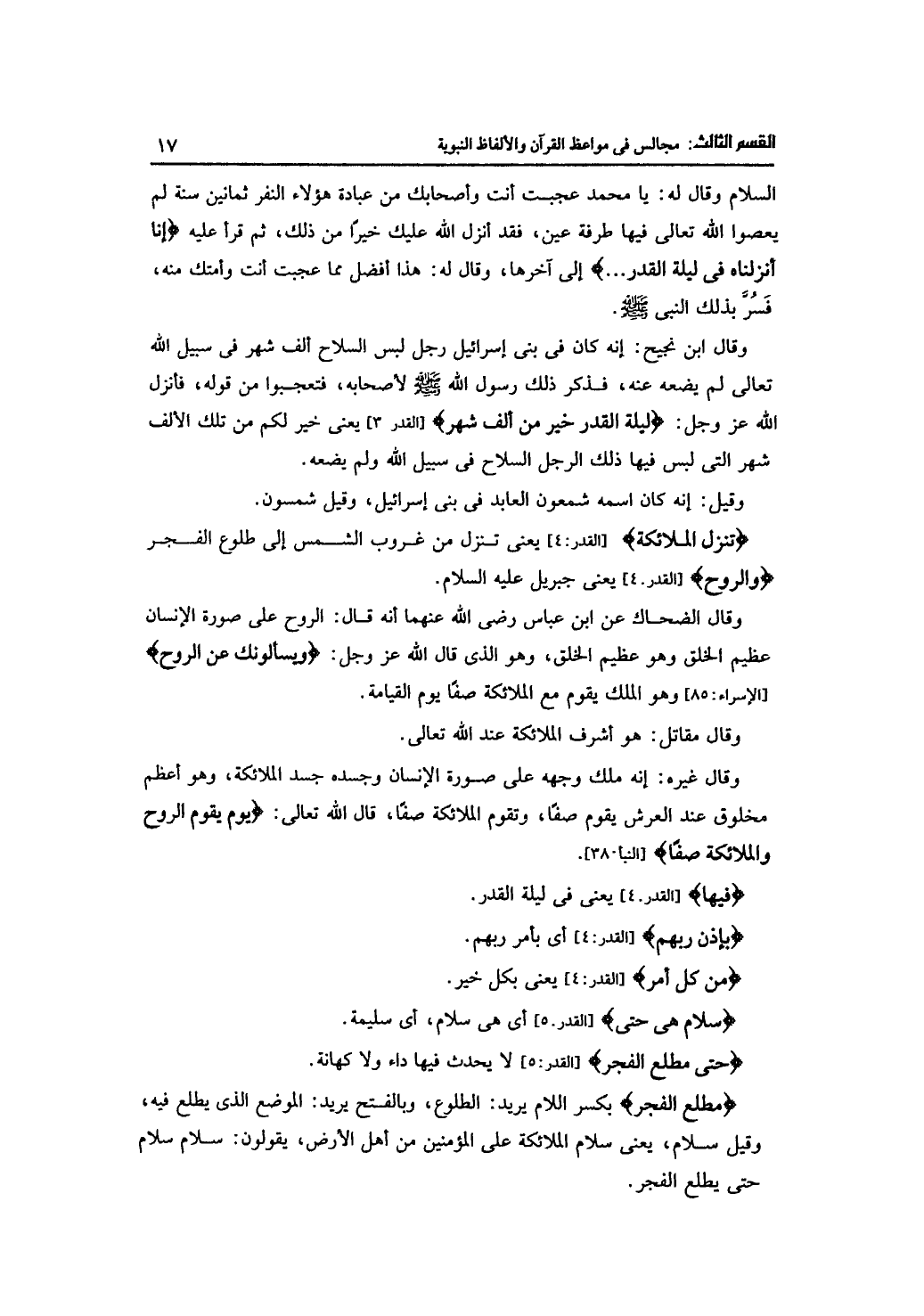 السلام -وقال له: يا محمد عجبت أنت وأصحابك من عبادة هؤلاء النفر ثمانين سنة لم يعصوا الله تعالى فيها طرفة عين، فقد أنزل الله عليك خيرًا من ذلك، ثم قرأ عليه {إنا أنزلناه في ليلة القدر ...} إلى آخرها، وقال له: هذا أفضل مما عجبت أنت وأمتك منه، فسر بذلك النبي -صلى الله عليه وسلم -.