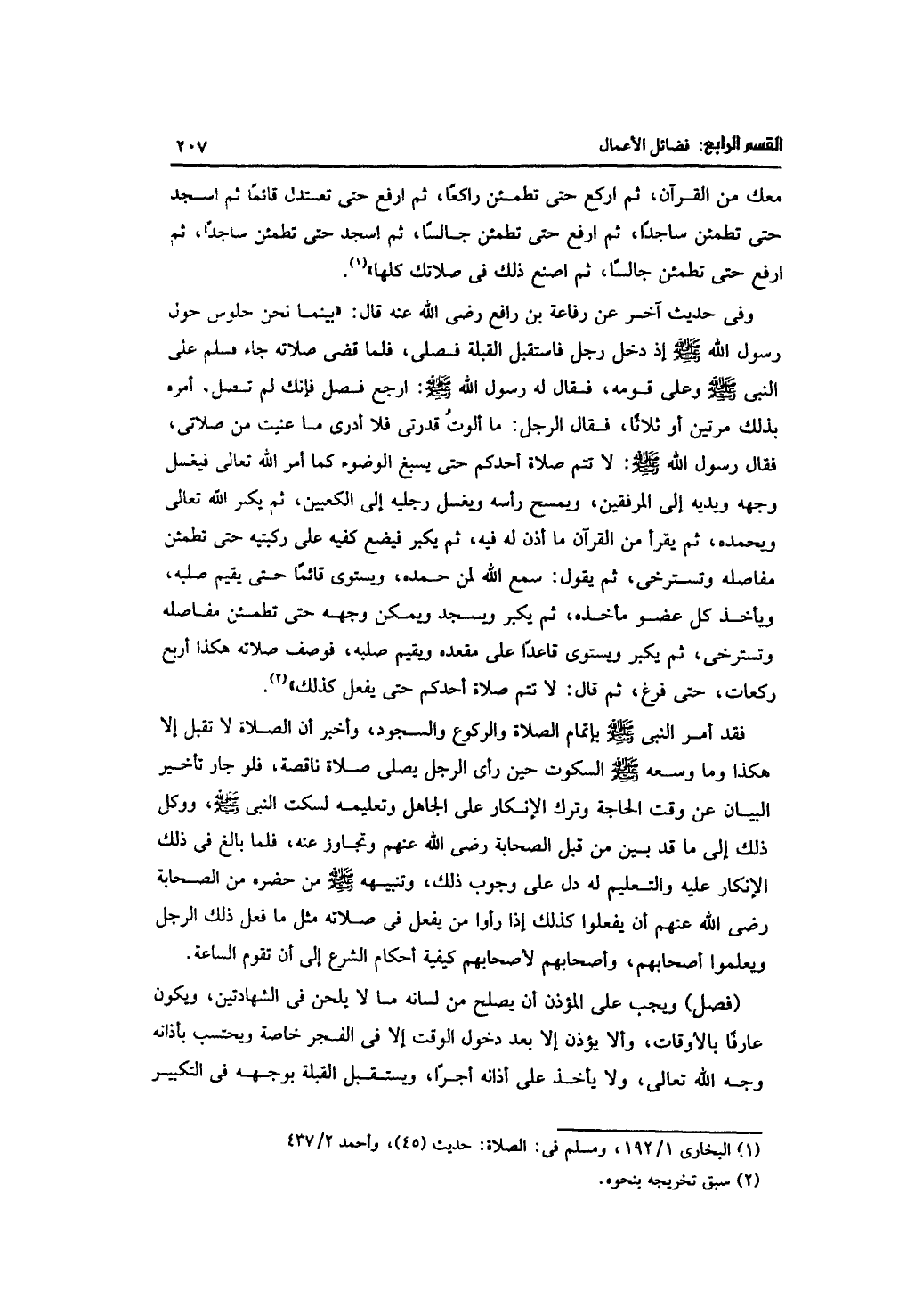 وفي حديث آخر عن رفاعة بن رافع -رضي الله عنه- قال: "بينما نحن جلوس حول رسول الله -صلى الله عليه وسلم- إذ دخل رجل فاستقبل القبلة فصلى، فلما قضى صلاته جاء فسلم على النبي -صلى الله عليه وسلم- وعلى قومه، فقال له رسول الله -صلى الله عليه وسلم-: ارجع فصل فإنك لم تصل، أمره بذلك مرتين أو ثلاثًا، فقال الرجل: ما ألوت قدرتي فلا أدري ما عنيت من صلاتي، فقال رسول الله -صلى الله عليه وسلم-: لا تتم صلاة أحدكم حتى يسبغ الوضوء كما أمر الله تعالى فيغسل وجهه ويديه إلى المرفقين، ويمسح رأسه ويغسل رجليه إلى الكعبين، ثم يكبر الله تعالى ويحمده، ثم يقرأ من القرآن ما أذن له فيه، ثم يكبر فيضع كفيه على ركبتيه حتى تطمئن مفاصله وتسترخي، ثم يقول: سمع الله لمن حمده، ويستوي قائمًا حتى يقيم صلبه، ويأخذ كل عضو مأخذه، ثم يكبر ويسجد ويمكن وجهه حتى تطمئن مفاصله وتسترخي، ثم يكبر ويستوي قاعدًا على مقعده ويقيم صلبه، فوصف صلاته هكذا أربع ركعات، حتى فرغ، ثم قال: لا تتم صلاة أحدكم حتى يفعل كذلك".