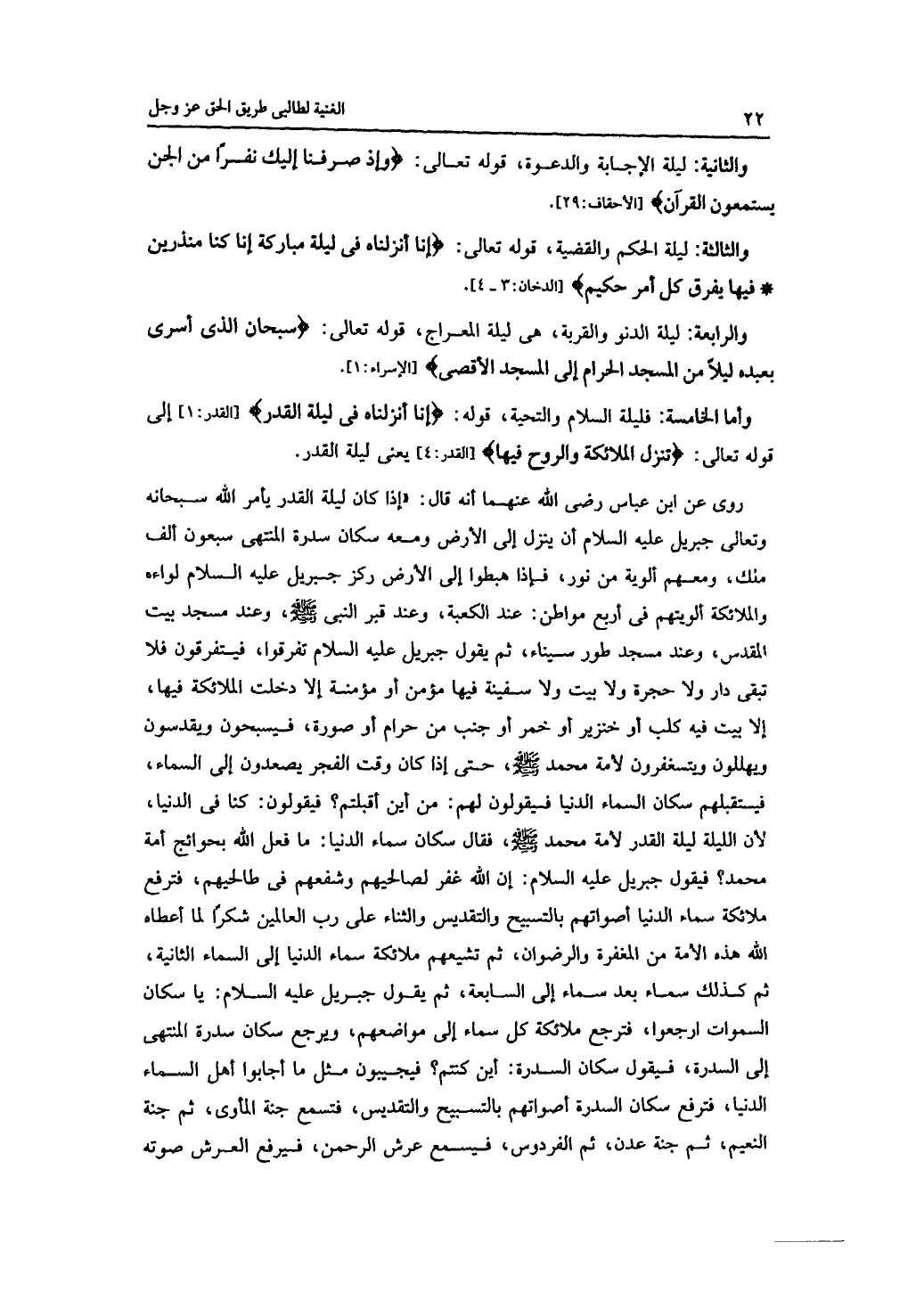 روى عن ابن عباس -رضي الله عنهما -أنه قال: "إذا كان ليلة القدر يأمر الله سبحانه وتعالى جبريل -عليه السلام -أن ينزل إلى الأرض ومعه سكان سدرة المنتهى سبعون ألف ملك، ومعهم ألوية من نور، فإذا هبطوا إلى الأرض ركز جبريل -عليه السلام -لواءه والملائكة ألويتهم في أربع مواطن: عند الكعبة، وعند قبر النبي -صلى الله عليه وسلم -، وعند مسجد بيت المقدس، وعند مسجد طور سيناء، ثم يقول جبريل -عليه السلام تفرقوا، فيتفرقون فلا تبقى دار ولا حجرة ولا بيت ولا سفينة فيها مؤمن أو مؤمنة إلا دخلت الملائكة فيها، إلا بيت فيه كلب أو خنزير أو خمر أو جنب من حرام أو صورة، فيسبحون ويقدسون ويهللون ويستغفرون لأمة محمد -صلى الله عليه وسلم -، حتى إذا كان وقت الفجر يصعدون إلى السماء، فيستقبلهم سكان السماء الدنيا فيقولون لهم: من أين أقبلتم؟ فيقولون: كنا في الدنيا، لأن الليلة ليلة القدر لأمة محمد -صلى الله عليه وسلم -، فقال سكان سماء الدنيا: ما فعل الله بحوائج أمة محمد؟ فيقول جبريل -عليه السلام -إن الله غفر لصالحيهم وشفعهم في طالحيهم، فترفع ملائكة سماء الدنيا أصواتهم بالتسبيح والتقديس والثناء على رب العالمين شكرًا لما أعطاه الله هذه الأمة من المغفرة والرضوان، ثم تشيعهم ملائكة سماء الدنيا إلى السماء الثانية، ثم كذلك سماء بعد سماء إلى السابعة، ثم يقول جبريل -عليه السلام -: يا سكان السموات ارجعوا، فترجع ملائكة كل سماء إلى مواضعهم، ويرجع سكان سدرة المنتهى إلى السدرة، فيقول سكان السدرة: أين كنتم؟ فيجيبون مثل ما أجابوا أهل السماء الدنيا، فترفع سكان السدرة أصواتهم بالتسبيح والتقديس، فتسمع جنة المأوى، ثم جنة النعيم، ثم جنة عدن، ثم الفردوس، فيسمع عرش الرحمن، فيرفع العرش صوته