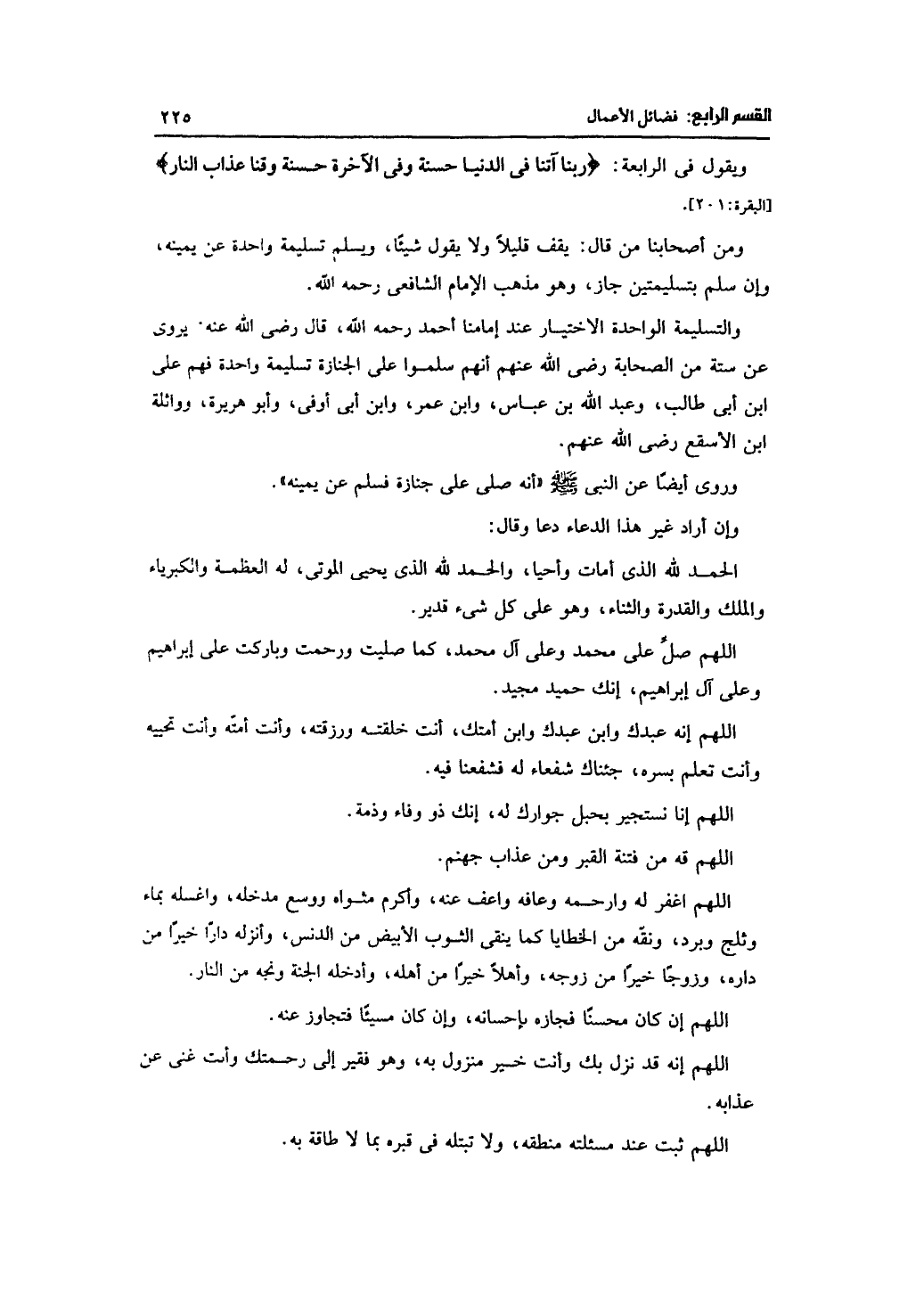 والتسليمة الواحدة الاختيار عند إمامنا أحمد -رحمه الله-، قال -رضي الله عنه-: يروى عن ستة من الصحابة -رضي الله عنهم- أنهم سلموا على الجنازة تسليمة واحدة فهم علي ابن أبي طالب، وعبد الله بن عباس، وابن عمر، وابن أبي أوفى، وأبو هريرة، وواثلة ابن الأسقع -رضي الله عنهم-.