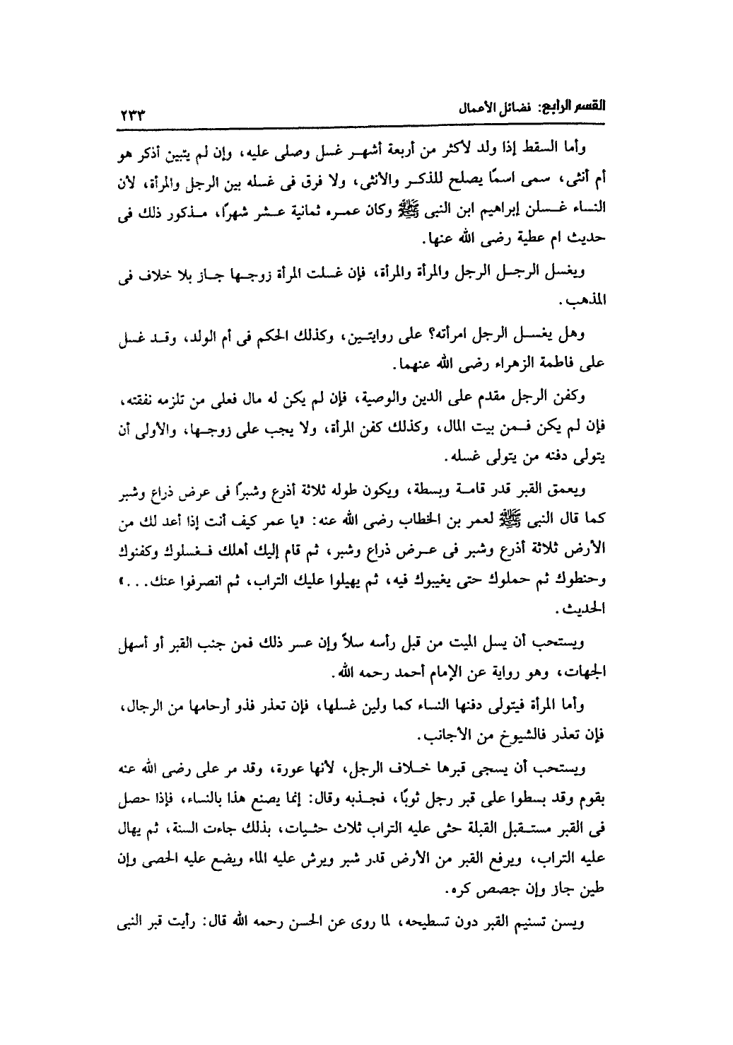 ويعمق القبر قدر قامة وبسطة، ويكون طوله ثلاثة أذرع وشبراً في عرض ذراع وشبر كما قال النبي -صلى الله عليه وسلم- لعمر بن الخطاب -رضي الله عنه-: "يا عمر كيف أنت إذا أعد لك من الأرض ثلاثة أذرع وشبر في عرض ذراع وشبر، ثم قام إليك أهلك فغسلوك وكفنوك وحنطوك ثم حملوك حتى يغيبوك فيه، ثم يهيلوا عليك التراب، ثم انصرفوا عنك ... " الحديث.