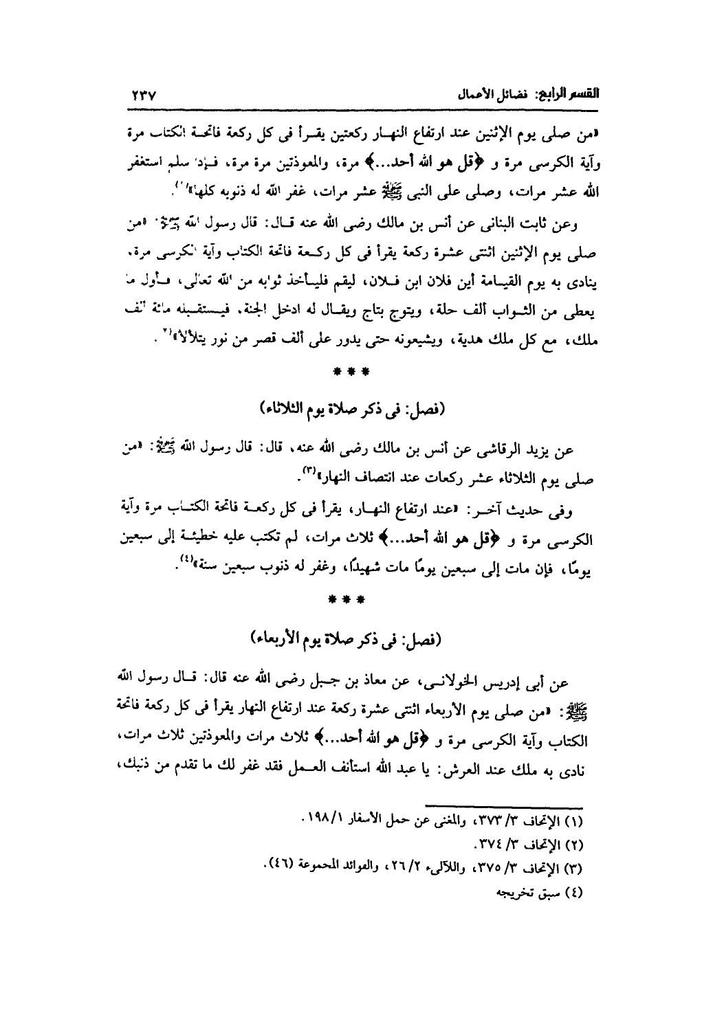 وفي حديث آخر: "عند ارتفاع النهار، يقرأ في كل ركعة فاتحة الكتب مرة وآية الكرسي مرة و {قل هو الله أحد ...} ثلاث مرات، لم تكتب عليه خطيئة إلى سبعن يوماً، فإن مات إلى سبعين يوماً مات شهيداً، وغفر له ذنوب سبعين سنة".