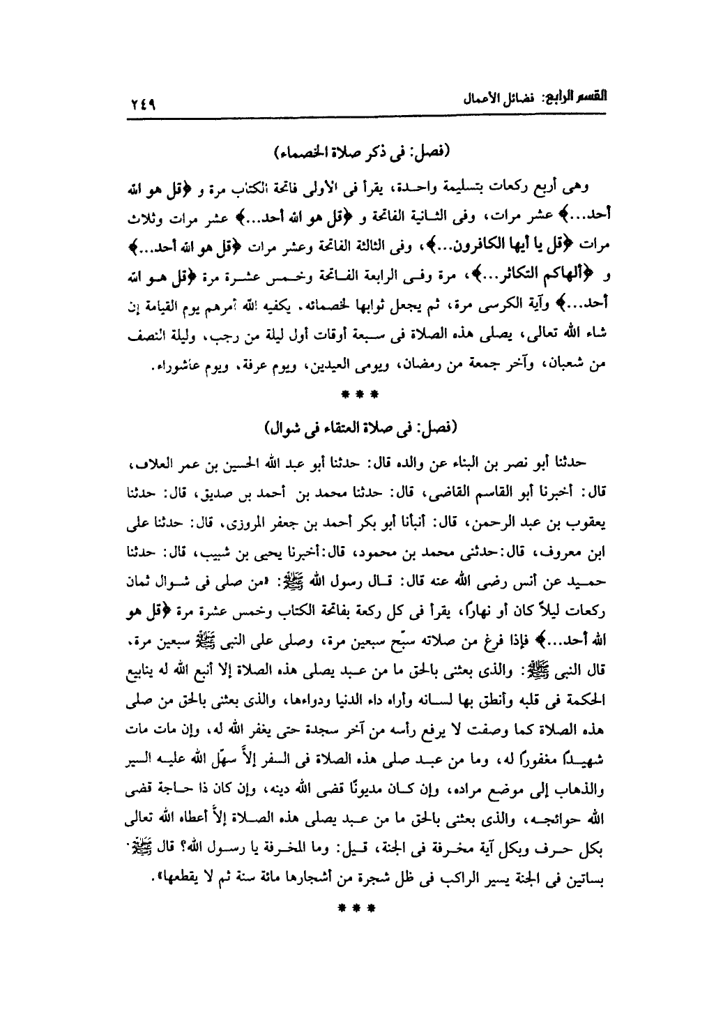 حدثنا أبو نصر بن البناء عن والده قال: حدثنا أبو عبد الله الحسين بن عم العلاف، قال: أخبرنا أبو القاسم القاضي، قال: حدثنا محمد بن أحمد بن صديق، قال: حدثنا يعقوب بن عبد الرحمن، قال: أنبأنا أبو بكر أحمد بن جعفر المروزي، قال: حدثنا على ابن معروف، قال: حدثني محمد بن محمود، قال: أخبرنا يحيى بن شبيب، قال: حدثنا حميد عن أنس -رضي الله عنه- قال: قال رسول الله -صلى الله عليه وسلم-: "من صلى في شوال ثمان ركعات ليلاً كان أو نهاراً، يقرأ في كل ركعة بفاتحة الكتاب وخمس عشرة مرة {قل هو الله أحد ...} فإذا فرغ من صلاته سبح سبعين مرة، وصلى على النبي -صلى الله عليه وسلم- سبعين مرة، قال النبي -صلى الله عليه وسلم-: والذي بعثني بالحق ما من عبد يصلي هذه الصلاة إلا أنبع الله له ينابيع الحكمة في قلبه وأنطق بها لسانه وأراه داء الدنيا ردواءها، والذي بعثني بالحق من صلى هذه الصلاة كما وصفت لا يرفع رأسه من آخر سجدة حتى يغفر الله له، وإن مات مات شهيداً مغفوراً له، وما من عبد صلى هذه الصلاة في السفر إلا سهل الله عليه السير والذهاب إلى موضع مراده، وإن كان مديوناً قضى الله دينه، وإن كان ذا حاجة قضى الله حوائجه، والذي بعثني بالحق ما من عبد يصلي هذه الصلاة إلا أعطاه الله تعالى بكل حرف وبكل آية مخرفة في الجنة، قيل: وما المخرفة يا رسول الله؟ قال -صلى الله عليه وسلم-: بساتين في الجنة يسير الراكب في ظل شجرة من أشجارها مائة سنة ثم لا يقطعها".