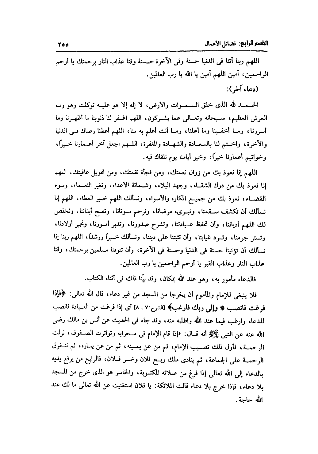 فلا ينبغي للإمام والمأموم أن يخرجا من المسجد من غير دعاء، قال الله تعالى: {فإذا فرغت فانصب* وإلى ربك فارغب} [الشرح: 7 - 8] أي إذا فرغت من العبادة فانصب للدعاء وارغب فيما عند الله واطلبه منه، وقد جاء في الحديث عن أنس بن مالك -رضي الله عنه عن النبي -صلى الله عليه وسلم- أنه قال: "إذا قام الإمام في محرابه وتواترت الصفوف، نزلت الرحمة، فأول ذلك تصيب الإمام، ثم من عن يمينه، ثم من عن يساره، ثم تتفرق الرحمة على الجماعة، ثم ينادي ملك ربح فلان وخسر فلان، فالرابح من يرفع يديه بالدعاء إلى الله تعالى إذا فرغ من صلاته المكتوبة، والخاسر هو الذي خرج من المسجد بلا دعاء، فإذا خرج بلا دعاء قالت الملائكة: يا فلان استغنيت عن الله تعالى ما لك عند الله حاجة.