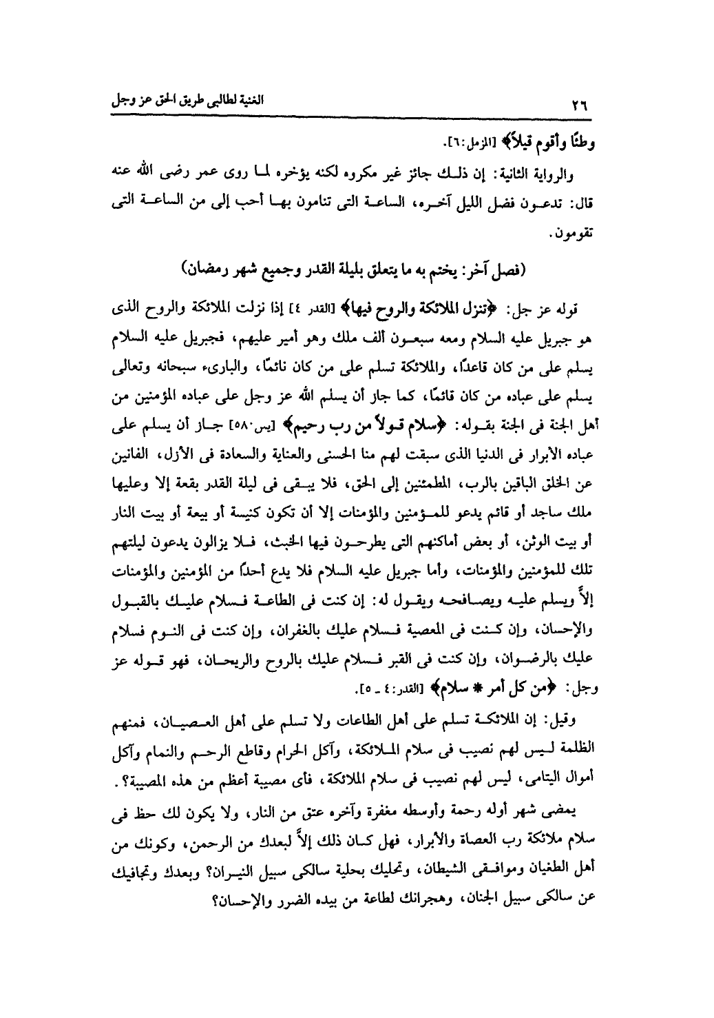قوله -عز وجل -: {تنزل الملائكة والروح فيها} [القدر: 4] إذا نزلت الملائكة والروح الذي هو جبريل -عليه السلام -ومعه سبعون ألف ملك وهو أمير عليهم، فجبريل -عليه السلام -يسلم على من كان قاعدًا، والملائكة تسلم على من كان نائمًا، والبارئ -سبحانه وتعالى -يسلم على عباده من كان قائمًا، كما جاز أن يسلم الله -عز وجل -على عباده المؤمنين من أهل الجنة في الجنة بقوله: {سلام قولاً من رب رحيم} [يس: 58] جار أن يسلم على عباده الأبرار في الدنيا الذي سبقت لهم منا الحسنى والعناية والسعادة في الأزل، الفانين عن الخلق الباقين بالرب، المطمئنين إلى الحق، فلا يبقى في ليلة القدر بقعة إلا وعليها ملك ساجد أو قائم يدعو للمؤمنين والمؤمنات إلا أن تكون كنيسة أو بيعة أو بيت النار أو بيت الوثن، أو بعض أماكنهم التي يطرحون فيها الخبث، فلا يزالون يدعون ليلتهم تلك للمؤمنين والمؤمنات، وأما جبريل -عليه السلام -فلا يدع أحدًا من المؤمنين والمؤمنات إلا ويسلم عليه ويصافحه ويقول له: إن كنت في الطاعة فسلام عليك بالقبول والإحسان، وإن كنت في المعصية فسلام عليك بالغفران، وإن كنت في النوم فسلام عليك بالرضوان، وإن كنت في القبر فسلام عليك بالروح والريحان، فهو قوله -عز وجل -: {من كل أمر * سلام} [القدر: 4 - 5].