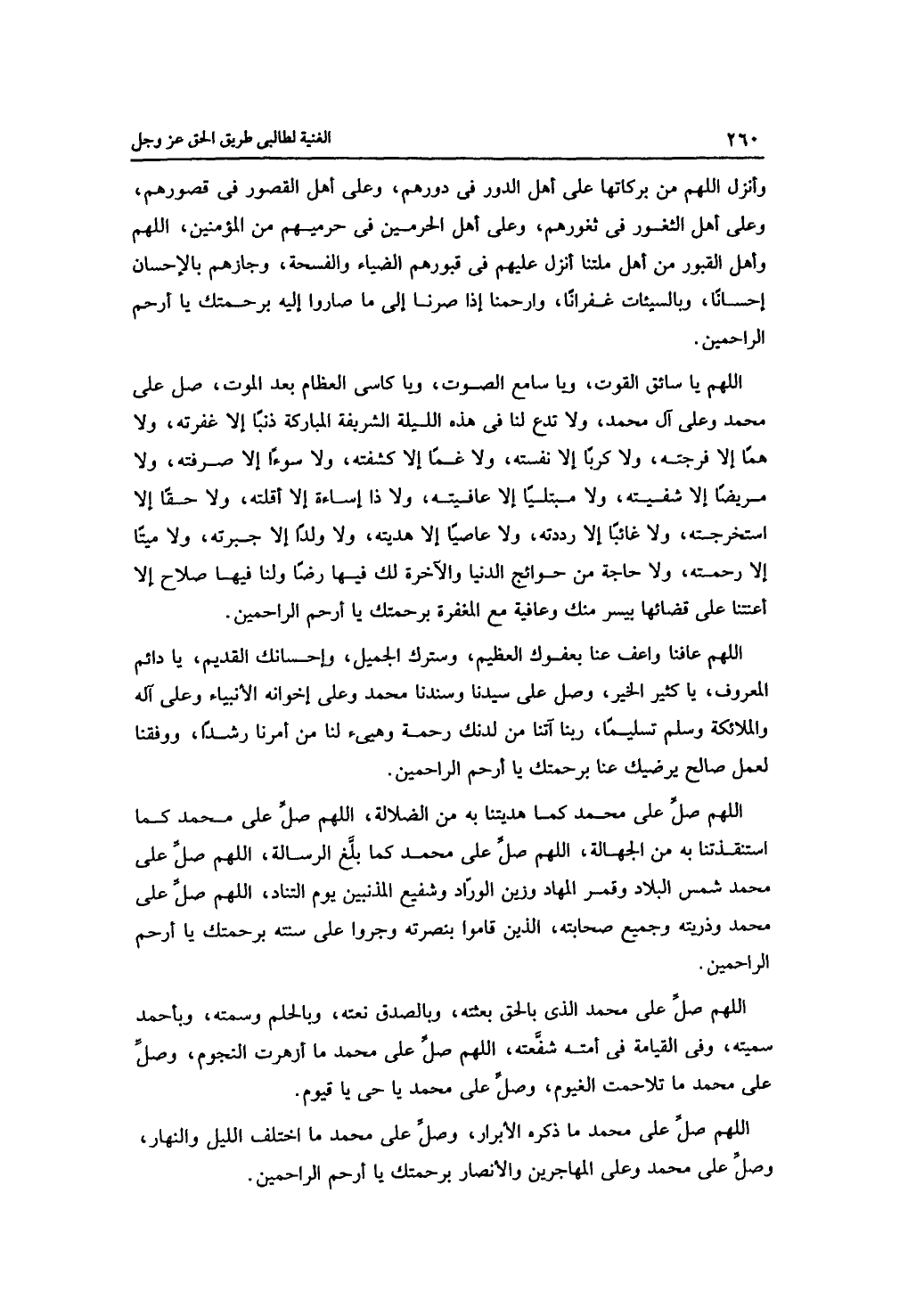 اللهم صلِّ على محمد كما هديتنا به من الضلالة، اللهم صلِّ على محمد كما استنقذتنا به من الجهالة، اللهم صلِّ على محمد كما بلَّغ الرسالة، اللهم صلِّ على محمد شمس البلاد وقمر المهاد وزين الورّاد وشفيع المذنبين يوم التناد، اللهم صلِّ على محمد وذريته وجميع صحابته، الذين قاموا بنصرته وجروا على سنته برحمتك يا أرحم الراحمين.