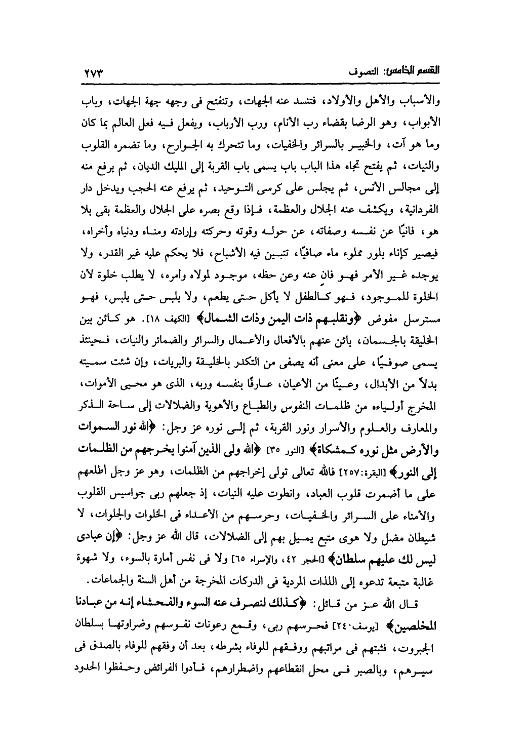 والأسباب والأهل والأولاد، فتنسد عنه الجهات، وتنفتح في وجهه جهة الجهات، وباب الأبواب، وهو الرضا بقضاء رب الأنام، ورب الأرباب، ويفعل فيه فعل العالم بما كان وما هو آت، والخبير بالسرائر والخفيات، وما تتحرك به الجوارح، وما تضمره القلوب والنيات، ثم يفتح تجاه هذا الباب باب يسمى باب القربة إلى المليك الديان، ثم يرفع منه إلى مجالس الأنس، ثم يجلس على كرسي التوحيد، ثم يرفع عنه الحجب ويدخل دار الفردانية، ويكشف عنه الجلال والعظمة، فإذا وقع بصره على الجلال والعظمة بقى بلا هو، فانيًا عن نفسه وصفاته، عن حوله وقوته وحركته وإرادته ومناه ودنياه وأخراه، فيصير كإناء بلور مملوء ماء صافيًا، تتبين فيه الأشباح، فلا يحكم عليه غير القدر، ولا يوجده غير الأمر فهو فانٍ عنه وعن حظه، موجود لمولاه وأمره، لا يطلب خلوة لأن الخلود للموجود، فهو كالطفل لا يأكل حتى يطعم، ولا يلبس حتى يلبس، فهو مسترسل مفوض {ونقلبهم ذات اليمين وذات الشمال} [الكهف: 18]. هو كائن بين الخليقة بالجسمان، بائن عنهم بالأفعال والأعمال والسرائر والضمائر والنيات، فحينئذ يسمى صوفيًا، على معنى أنه يصفى من التكدر بالخيقة والبريات، وإن شئت سميته بدلاً من الأبدال، وعينًا من الأعيان، عارفًا بنفسه وربه، الذي هو محيى الأموات، المخرج أولياءه من ظلمات النفوس والطباع والأهوية والضلالات إلى ساحة الذكر والمعارف والعلوم والأسرار ونور القربة، ثم إلى نوره عز وجل: {الله نور السموات والأرض مثل نوره كمشكاة} [النور:35] {الله ولي الذين آمنوا يخرجهم من الظلمات إلى النور} [البقرة: 257] فالله تعالى تولى إخراجهم من الظلمات، وهو عز وجل أطلعهم على ما أضمرت قلوب العباد، وانطوت عليه النيات، إذ جعلهم ربي جواسيس القلوب والأمناء على السرائر والخفيات، وحرسهم من الأعداء في الخلوات والجلوات، لا شيطان مضل ولا هوى متبع يميل بهم إلى الضلالات، قال الله عز وجل: {إن عبادي ليس لك عليهم سلطان} [الحجر: 42، والإسراء: 65] ولا في نفس أمارة بالسوء، ولا شهوة غالبة متبعة تدعوه إلى اللذات المردية في الدركات المخرجة من أهل السنة والجماعات.
