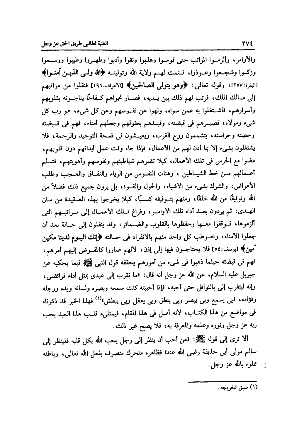 والأوامر، وألزموا المراتب حتى قوموا وهذبوا ونقوا وأدبوا وطهروا وطيبوا ووسعوا وزكوا وشجعوا وعوذوا، فتمت لهم ولاية الله وتوليته {الله ولي الذين آمنوا} [البقرة:257]، وقوله تعالى: {وهو يتولى الصالحين} [الأعراف: 196] فنقلوا من مراتبهم إلى مالك الملك، فرتب لهم ذلك بين يديه، فصار نجواهم كفاحًا يناجونه بقلوبهم وأسرارهم، فاشتغلوا به عمن سواه، ونهوا عن نفوسهم وعن كل شيء، هو رب كل شيء ومولاه، فصيرهم في قبضته، وقيدهم بعقولهم وجعلهم أمناء، فهم في قبضته وحصنه وحراسته، يتشممون روح القرب، ويعيشون في فسخة التوحيد والرحمة، فلا يشتغلون بشيء إلا بما أذن لهم من الأعمال، فإذا جاء وقت عمل أبدانهم دون قلوبهم، مضوا مع الحرس في تلك الأعمال، كيلا تضرهم شياطينهم ونفوسهم وأهويتهم، فتسلم أعمالهم من خط الشياطين، وهنات النفوس من الرياء والنفاق والعجب وطلب الأعراض، والشرك بشيء من الأشياء، والحول والقوة، بل يرون جميع ذلك فضلاً من الله وتوفيقًا من الله خلقًا، ومنهم بتوفيقه كسبًا، كيلا يخرجوا بهذه العقيدة من سنن الهدى، ثم يردون بعد أداء تلك الأوامر، وفراغ تلك الأعمال إلى مراتبهم التي ألزموها، فوقفوا معها وحفظوها بالقلوب والضمائر، وقد ينقلون إلى حاة بعد أن جعلوا الأمناء، وخوطب كل واحد منهم بالانفراد في حالته {إنك اليوم لدينا مكين أمين} [يوسف: 54] فلا يحتاجون فيها إلى إذن، لأنهم صاروا كالمفوض إليهم أمرهم، فهم في قبضته حيثما ذهبوا في شيء من أمورهم يحققه قول النبي -صلى الله عليه وسلم- فيما يحكيه عن جبريل عليه السلام، عن الله عز وجل أنه قال: "ما تقرب إلى عبدي بمثل أداء فرائضي، وإنه ليتقرب إلى بالنوافل حتى أحبه، فإذا أحببته كنت سمعه وبصره ولسانه ويده ورجله وفؤاده، فبي يسمع وبي يبصر وبي ينطق وبي يعقل وبي يبطش" فهذا الخبر قد ذكرناه في مواضع من هذا الكتاب، لأنه أصل في هذا المقام، فيمتلئ قلب هذا العبد بحب ربه عز وجل ونوره وعلمه والمعرفة به، فلا يصح غير ذلك.
