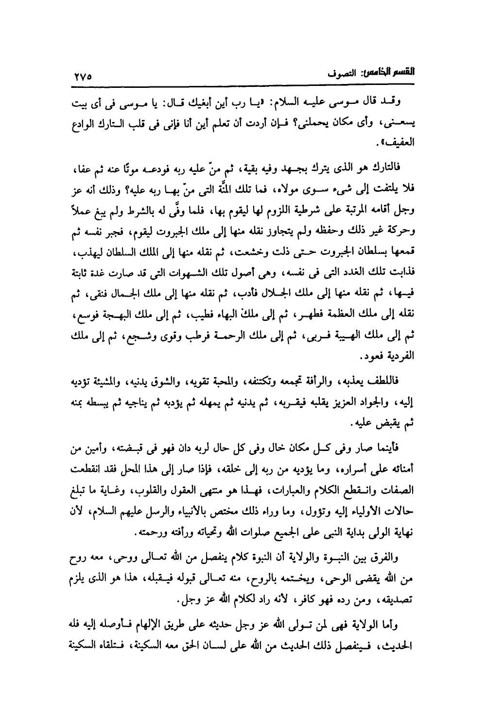 فأينما صار وفي كل مكان خال وفي كل حال لربه دان فهو في قبضته، وأمين من أمنائه على أسراره، وما يؤديه من ربه إلى خلقه، فإذا صار إلى هذا المحل فقد انقطعت الصفات وانقطع الكلام والعبارات، فهذا هو منتهى العقول والقلوب، وغاية ما تبلغ حالات الأولياء إليه وتؤول، وما وراء ذلك مختص بالأنبياء والرسل عليهم السلام، لأن نهاية الولي بداية النبي على الجميع صلوات الله وتحياته ورأفته ورحمته.